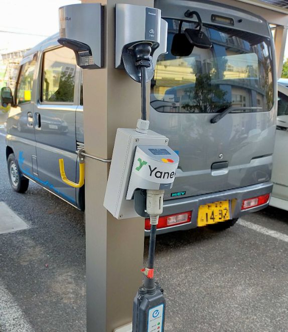 (1)郵便局に既に設置されているEV車両用普通充電コンセント16基に、簡易な方法で制御装置「YaneCube(ヤネキューブ)」(注)を後付けします。