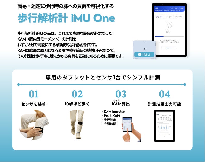 「歩行解析計 iMU One」は、膝関節にかかる負荷の指標の1つとされる膝内反モーメント(以下:KAM)をわずか5mの歩行、5分ほどで計測できる歩行分析計です。