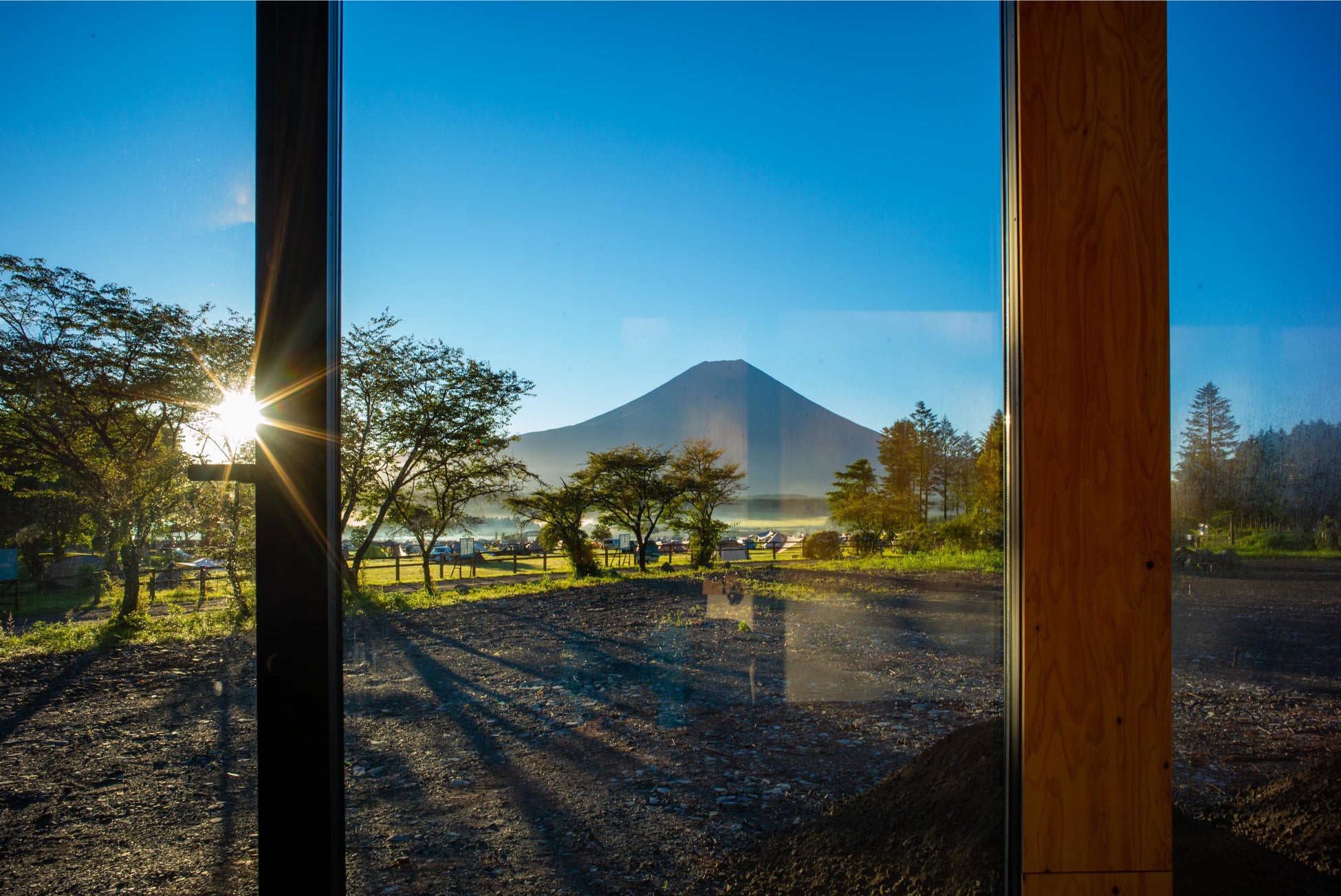 室内は、ヒノキ板や畳など、自然素材でコーディネートした、やさしい空間となっています。また、室内から風景を眺められる大きな窓があり、圧倒的な富士山ビューを臨みながら、室内でゆったりと快適にお過ごしいただけます。そして室内には、コンセントを完備しています。ふもとっぱらでのワーケーションも実施いただくことが可能です。