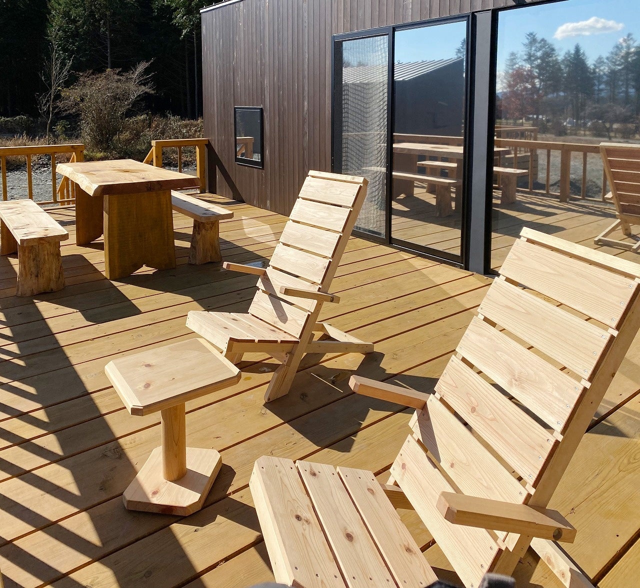 トレーラーハウスとセットになったデッキが屋外リビングとなり、自然環境を心地よく感じられる、思いやりのある時間をお過ごしいただきたいと思います。富士宮の木材を使って作られたウッドデッキと、天然木家具 地場産材だからこそのダイナミックで贅沢な木質家具は都会では味わえない風合いとなっています。