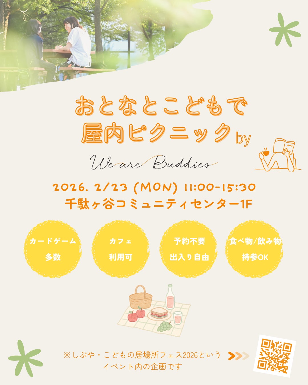 一般社団法人We are Buddies(所在地:東京都渋谷区、代表理事:加藤愛梨)は、2026年2月23日(月・祝)に千駄ヶ谷コミュニティセンターで開催される「しぶや・こどもの居場所フェス2026」に出展し、株式会社ボーネルンド(所在地:東京都渋谷区、代表取締役社長:中西みのり)の協力のもと、屋内ピクニック形式の体験ブースを実施します。