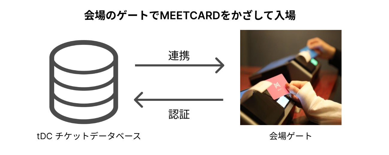 『MEET for tDC』により、MEETカードを当社がtDCサービスを提供しているスポーツ、エンターテインメント興行の入場チケットとして活用することができます。お客様は、MEETカードを入場ゲートにてかざすだけで入場が出来ます。イベントの運営側にとってもチケットのもぎりなど人的作業が発生せず、混雑を生みがちな入場時のオペレーションも効率化されます。