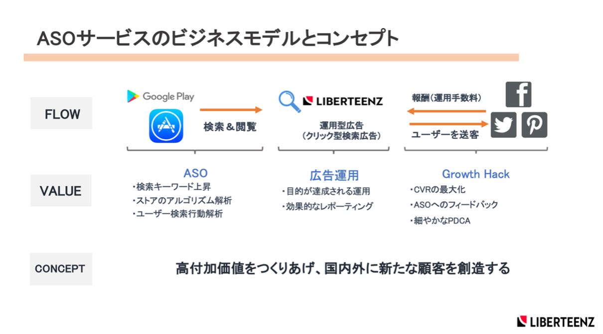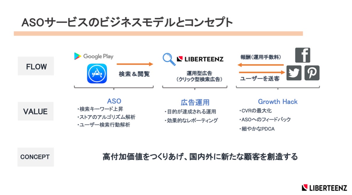 ・2017年:2008年から行ってきた何万回というアプリストアでの施策の経験から得たノウハウを使って、ASOサービスとして本格的に事業展開を開始する。そして今日にいたるまで業界の先駆者としてクライアントから絶大な信頼を勝ち取り、世界的な報道機関、大手EC会社、大手ゲーム会社などにリバティーンズのASOサービスが利用されている。