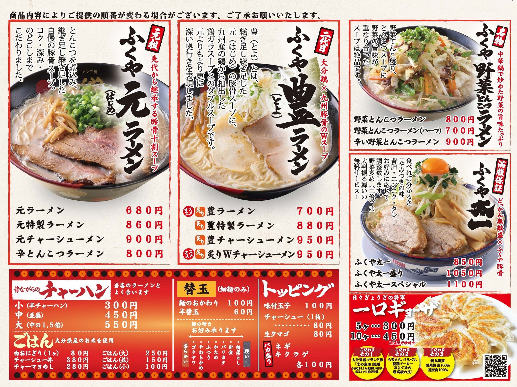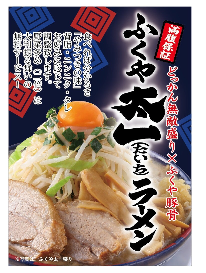 従来のふくやラーメンの元(はじめ)・豊(とよ)・野菜の三本柱に加え、ここでしか食べることのできない『どっかん無敵盛り太一商店』とのコラボメニューが新登場!