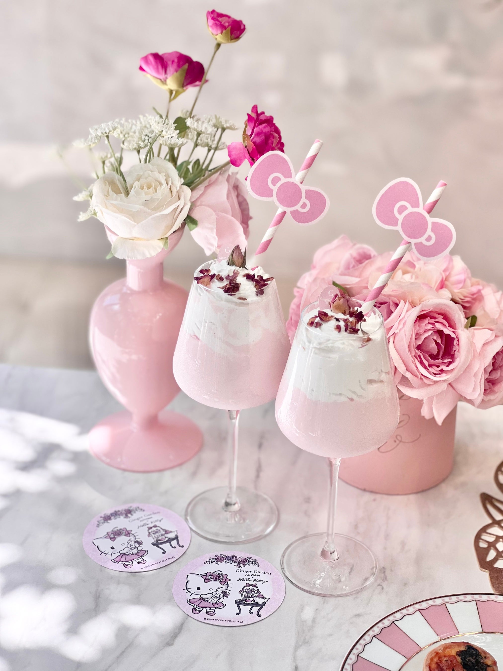 キティちゃんとテディジンジャーくんのオリジナルイラストコースター付き。濃厚ストロベリーローズミルク