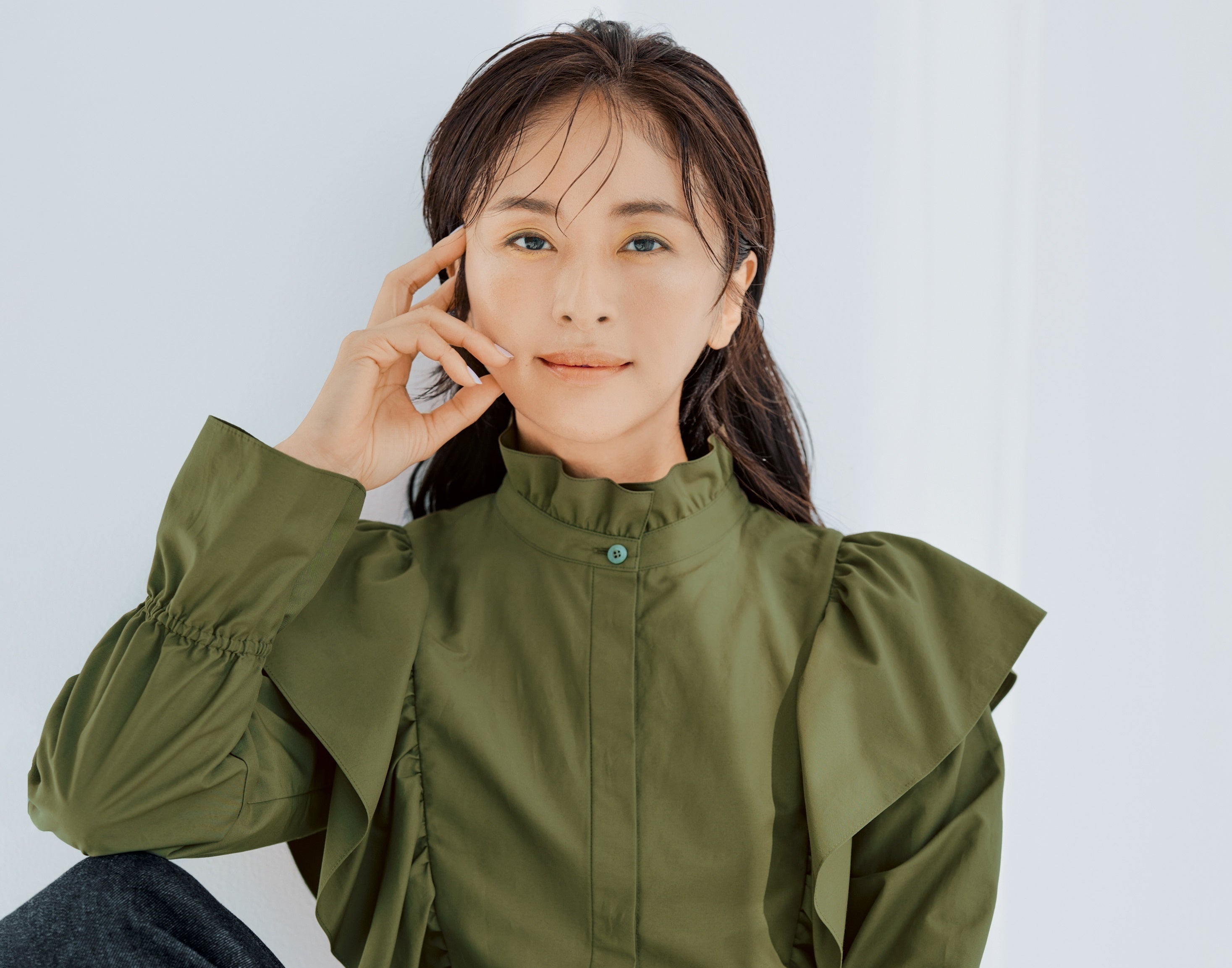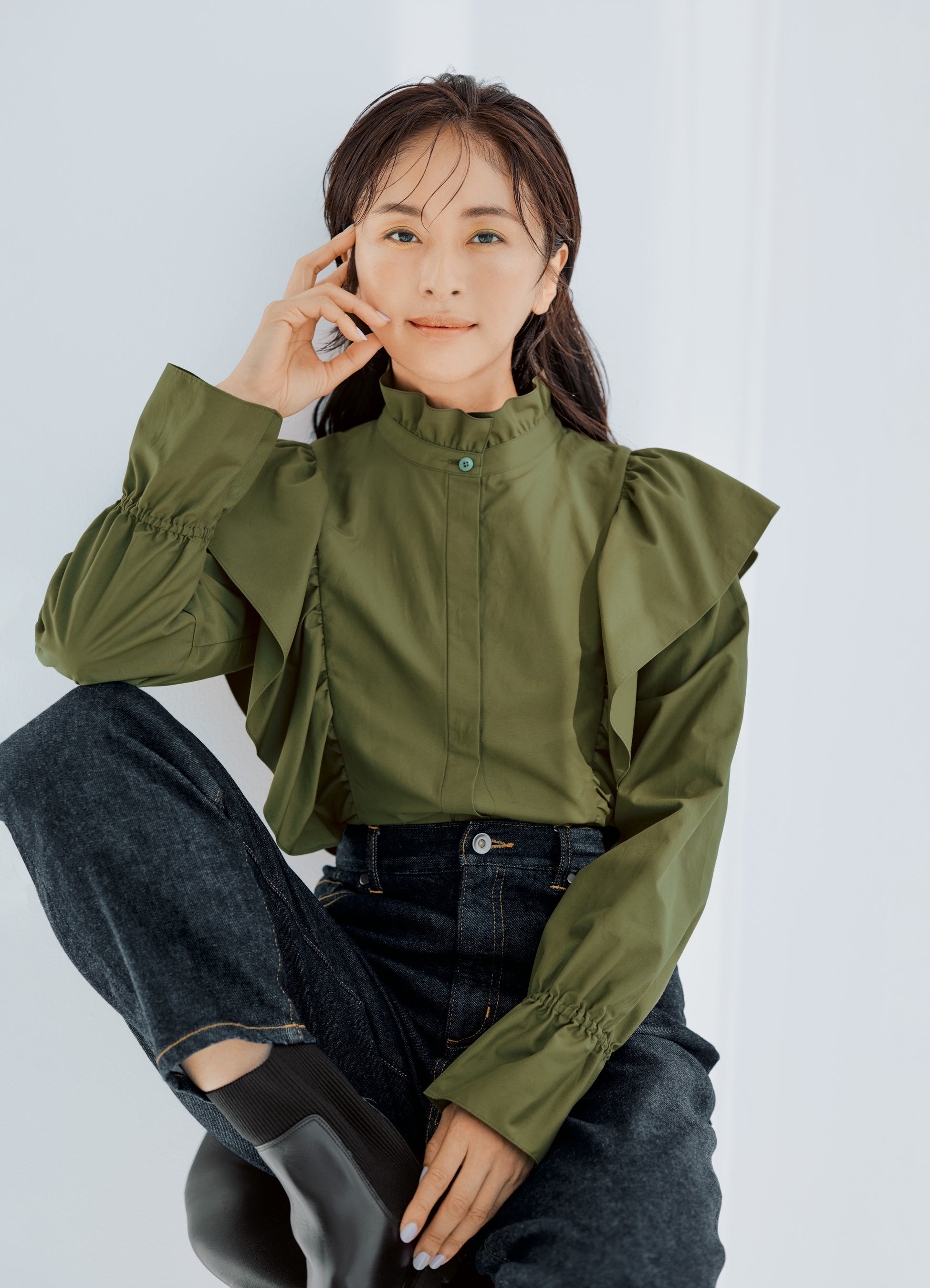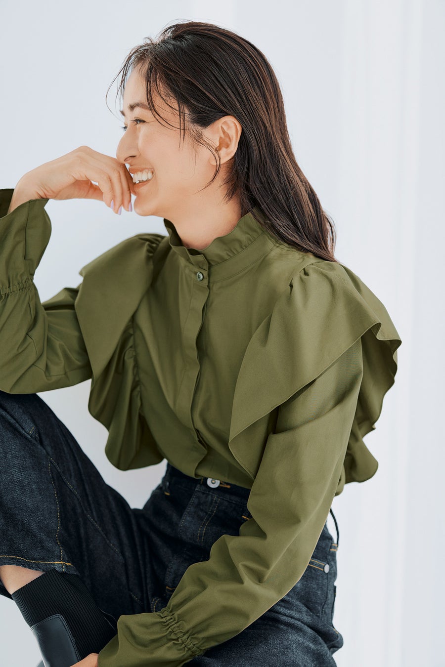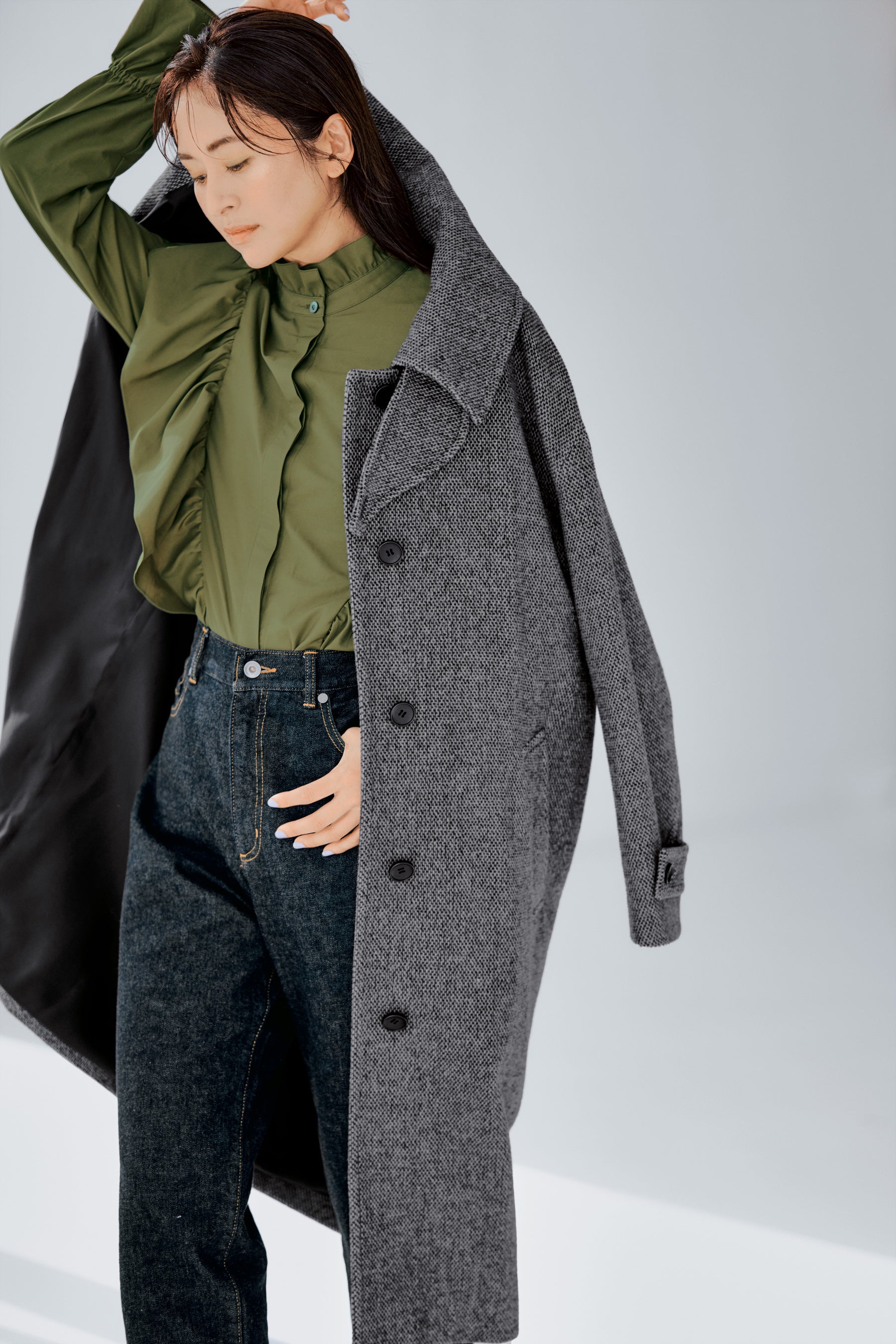 シックなカーキ色のフリルブラウスは甘すぎず品よく大人フェミニンを楽しめる一枚。アウターにはメンズライクなロングコートをセレクトしてシンプルだけど魅力的なデニムスタイルを。