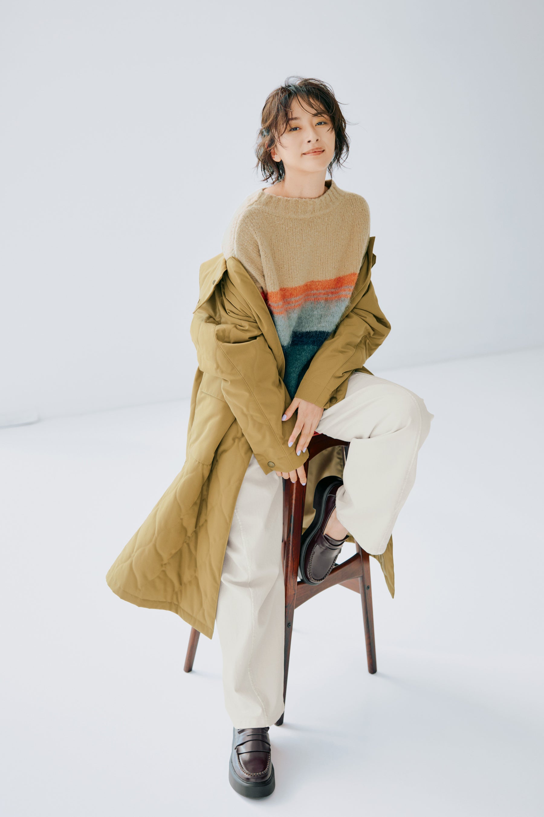 Knit ¥41,800 Coat ¥74,800 Shoes ¥37,400