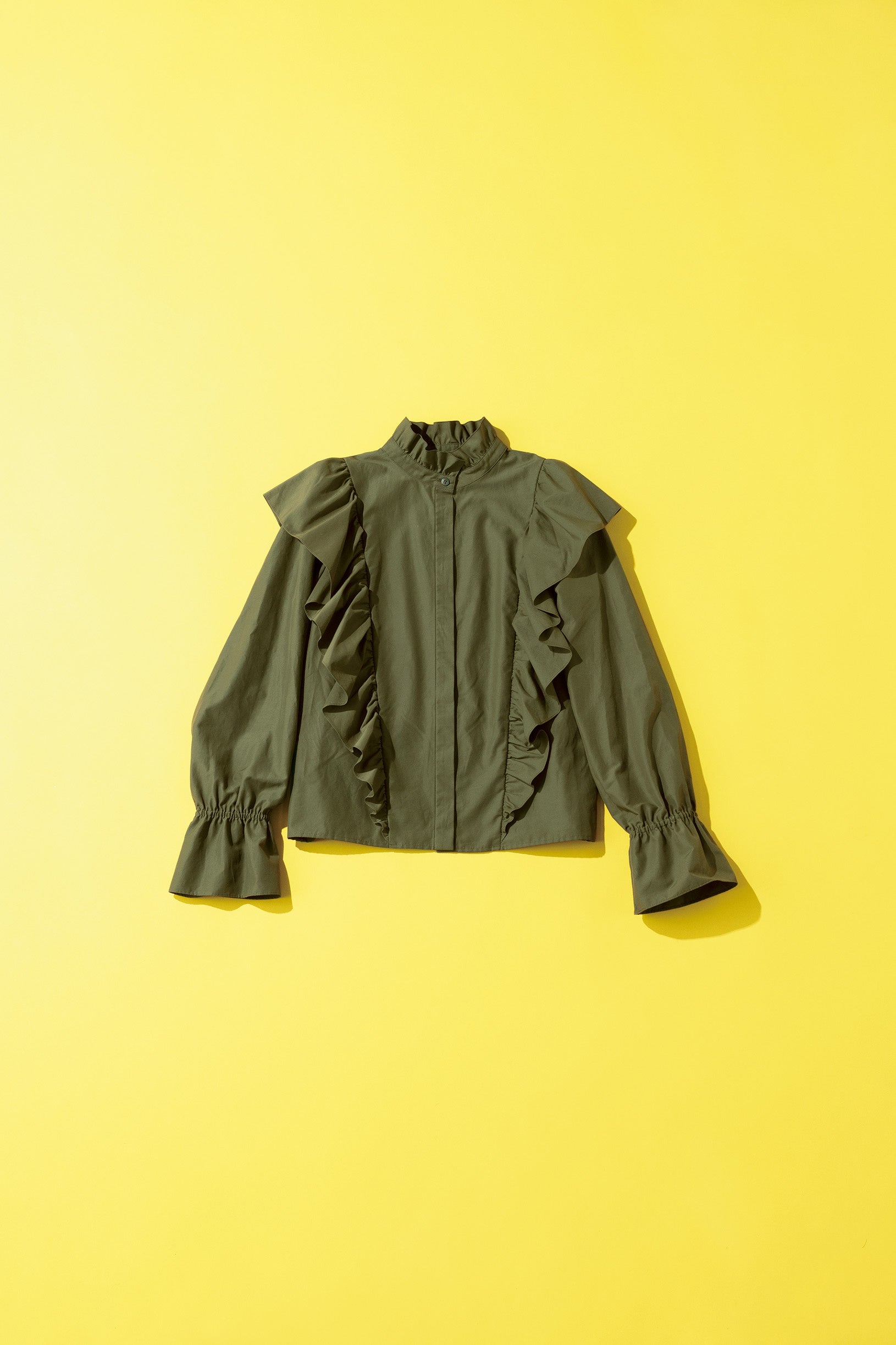 Q.シックなカーキ色とフリルのバランスが魅力のブラウスですが