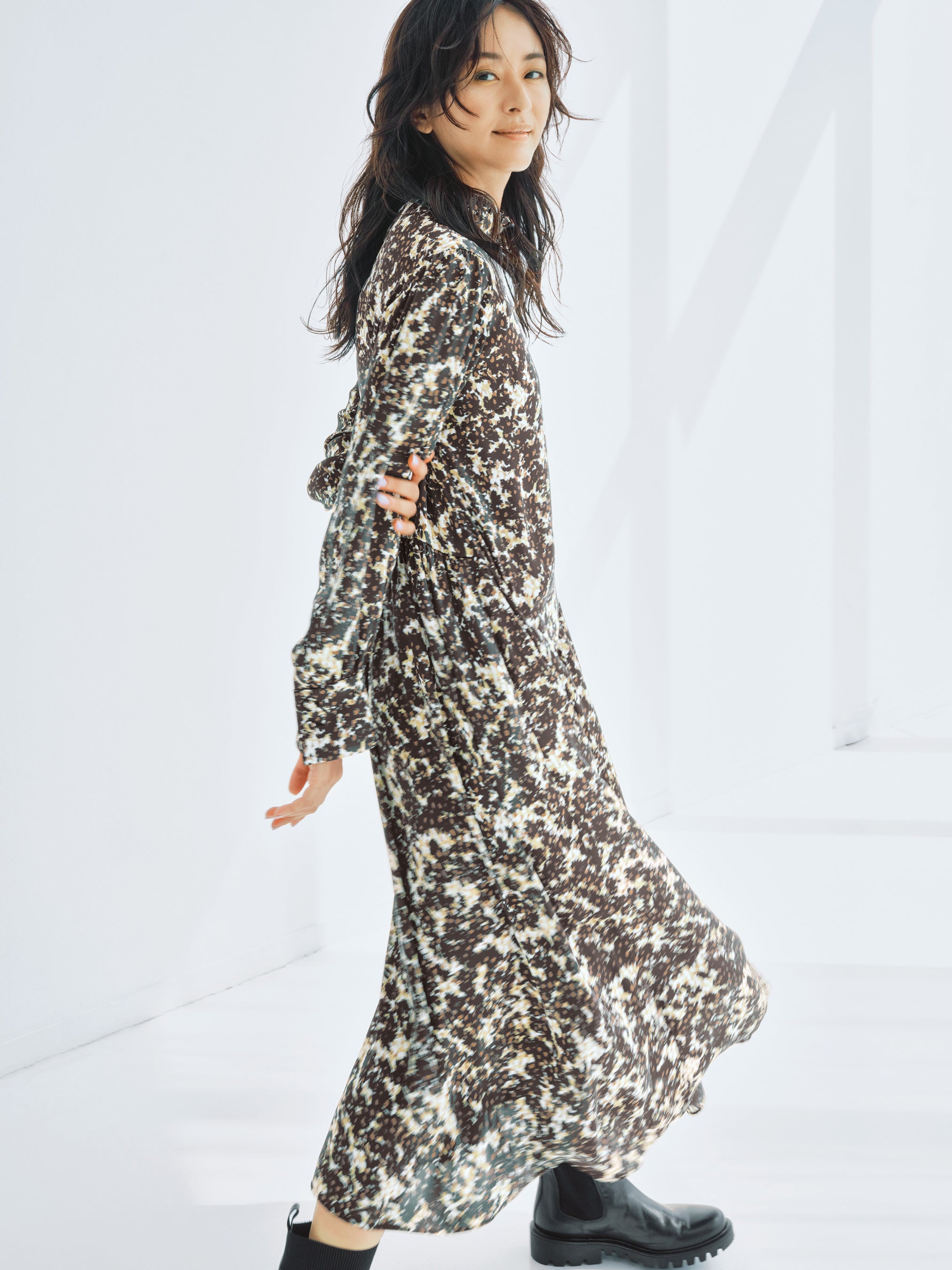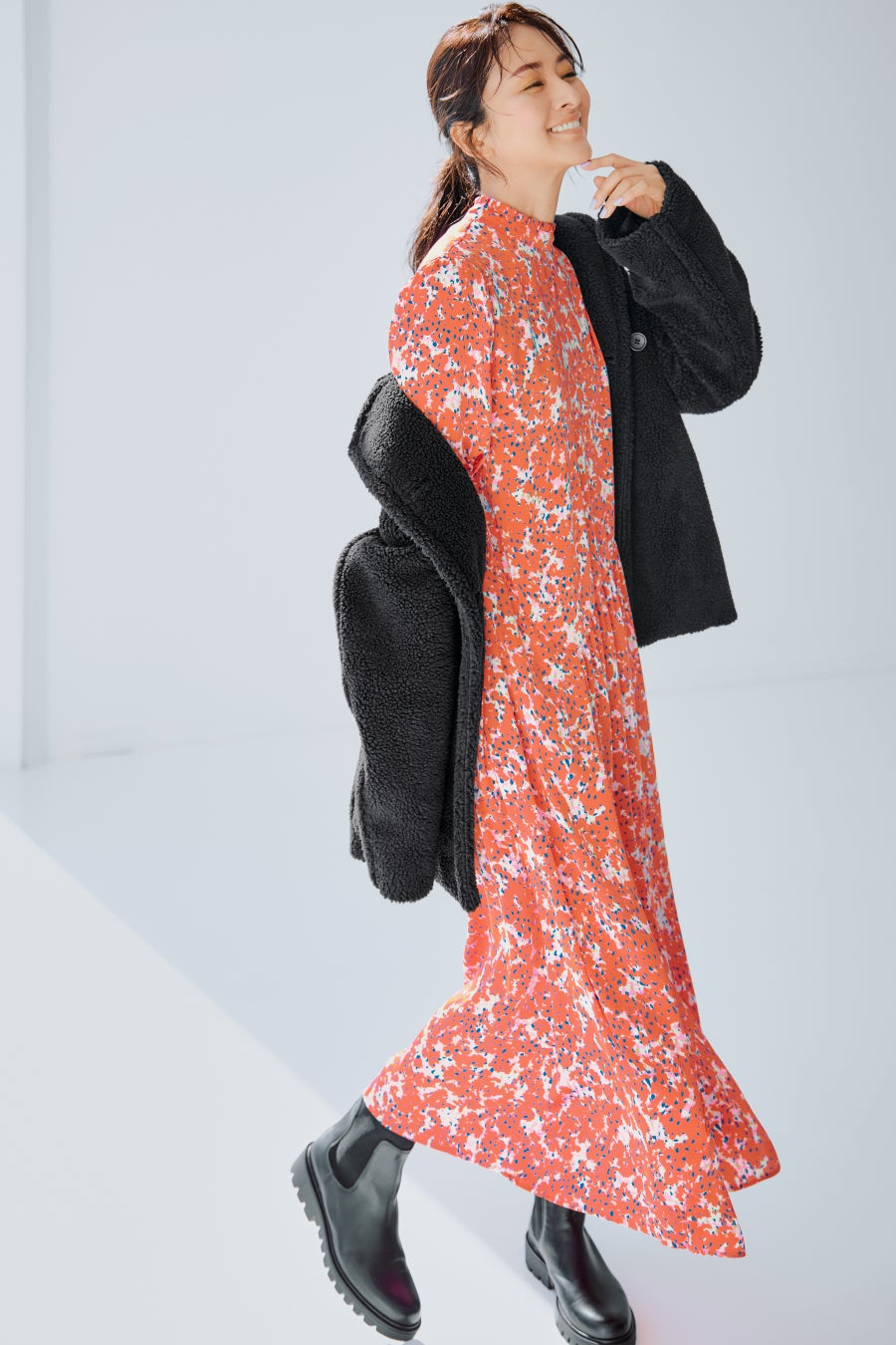 オリジナルプリントが華やかなワンピースは、アシメトリーに入れたローウエストの切替で美しいシルエットに。アウターには黒のボアコートをチョイス。サイドゴアブーツとプレイフルな着こなしに。