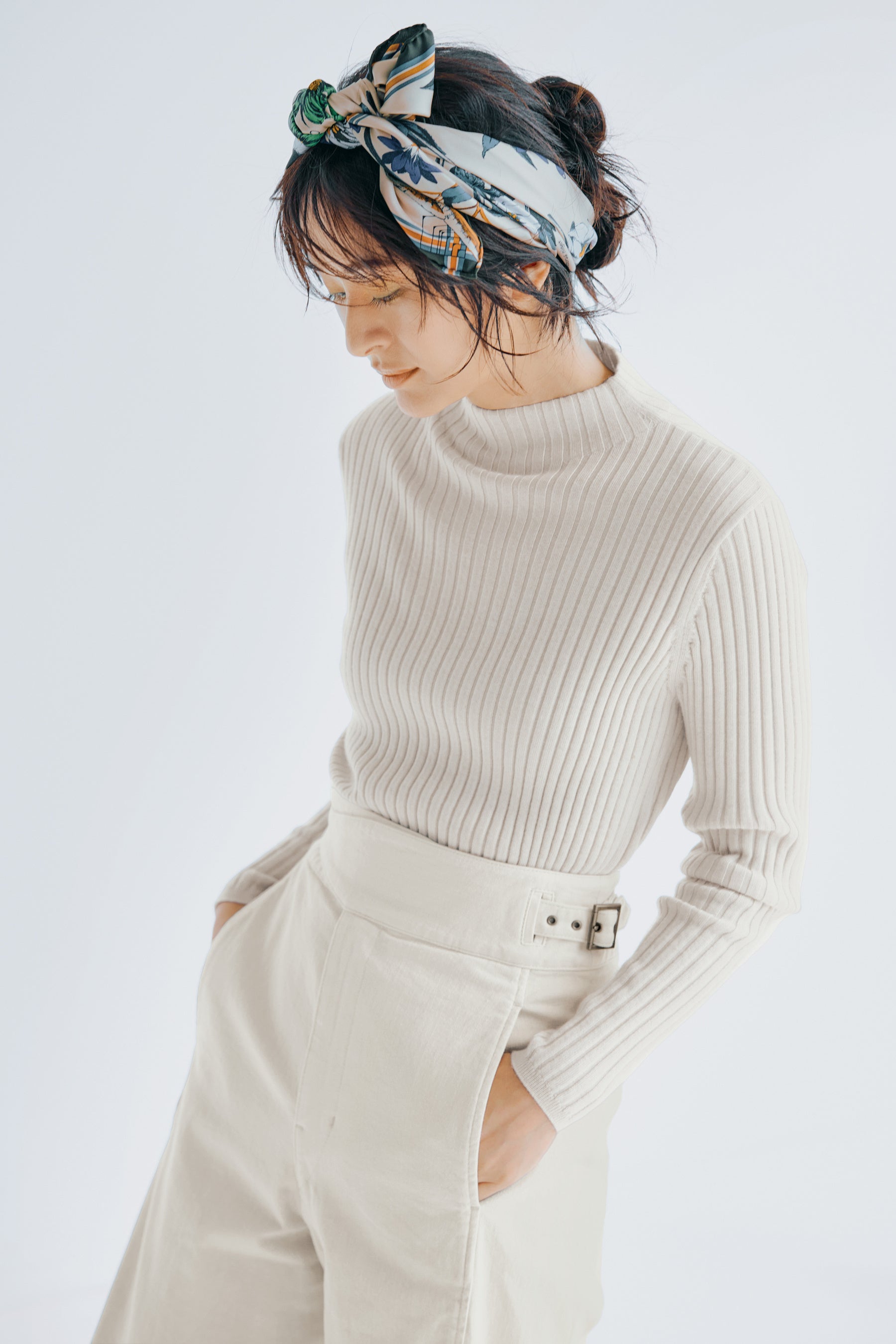 ハイウエストのホワイトデニムは、グルカパンツのディテールやシルエットの美しさが秀逸。白すぎないグレイッシュな色合いや、履き込むほどに柔らかく味わいの出る生地感も魅力。モヘヤニットやキルトコートでラフに。