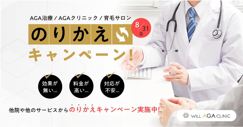 医療法人社団紡潤会(本社:東京都港区 理事長:宮内俊)は、『上質な医療による感動体験を』をブランドコンセプトに薄毛・AGAの治療を専門に行うウィルAGAクリニックにてAGA治療/AGAクリニック/育毛サロン『のりかえキャンペーン』を2022年6月1日(水)から2022年8月31日(水)まで実施します。