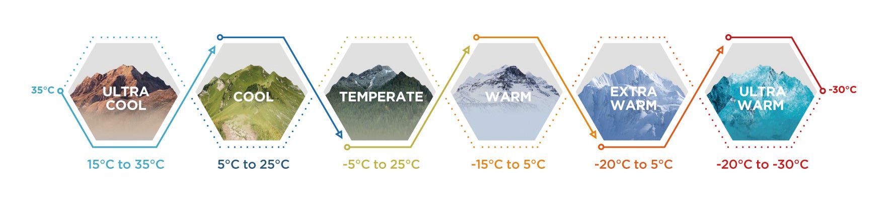 科学的な研究成果に裏付けされた、体温をコントロールするTHERM-IC THERMO TRANSFER TECHNOLOGYをベースに、これまでの厳しい雪山への対応だけでなく、夏場のトレッキングにも適した商品ラインナップに拡充いたします。具体的には、35℃から-30℃までの気温を6つに分類し、それぞれの温度域で最高のパフォーマンスを発揮する最適なギアをインソール、ソックス、ベスト、グローブといった4つの商品カテゴリでご用意しています。