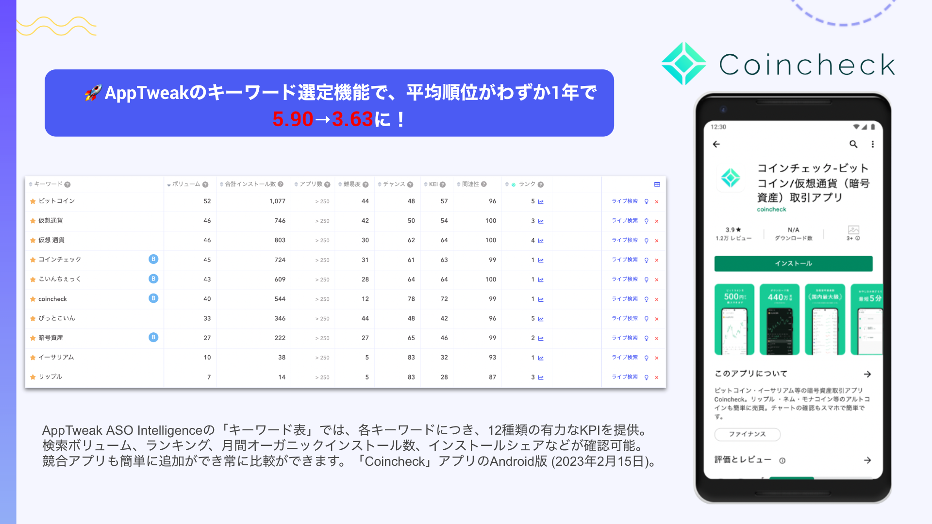 ASO対策ツール「AppTweak(アップトウィーク)」を提供するAppTweak Japan 合同会社 (本社:ブリュッセル、ベルギー、代表:Olivier Verdin、以下「AppTweak」) は、コインチェック株式会社(本社:東京都渋谷区、代表取締役:蓮尾 聡)に「AppTweak」を導入いただきました。
