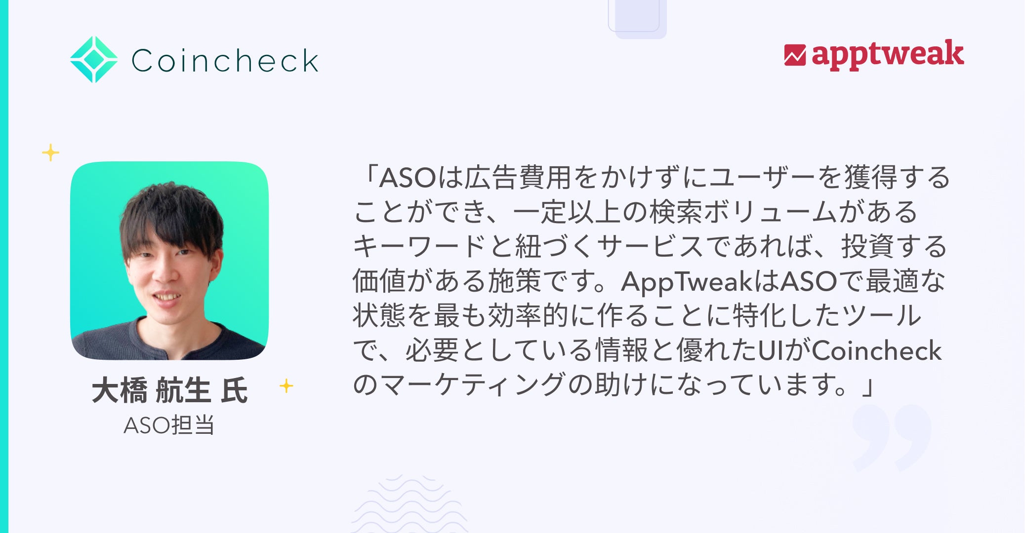 アプリダウンロード数4年連続「国内No.1(※)」の暗号資産取引サービス「Coincheck」を提供するコインチェック株式会社。狙ったキーワードで安定して上位表示させることを目的にASO対策を始めたとのこと。今回、同社でASOを担当している大橋航生氏にAppTweak導入の背景やその後の効果についてお話しいただきました。