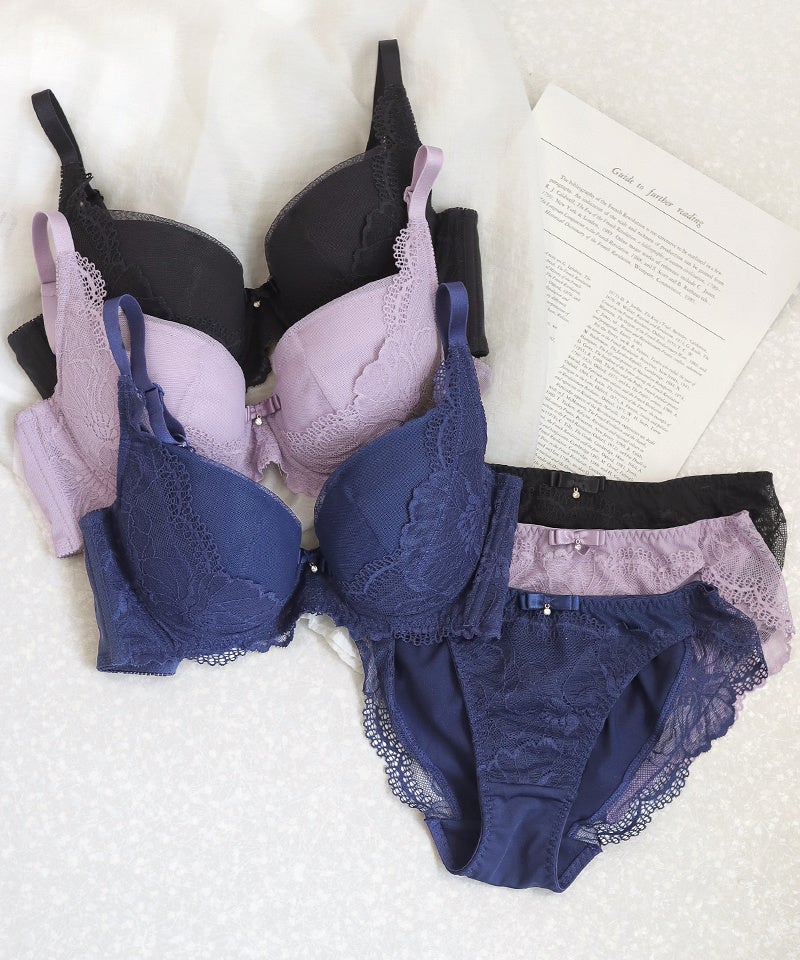 誰でも使いやすい上品なカラー。ショーツはフロントのみ透け防止の裏打ちを施し、高級感のあるエンブロイダリーレースの質感を贅沢に楽しめる一着です。