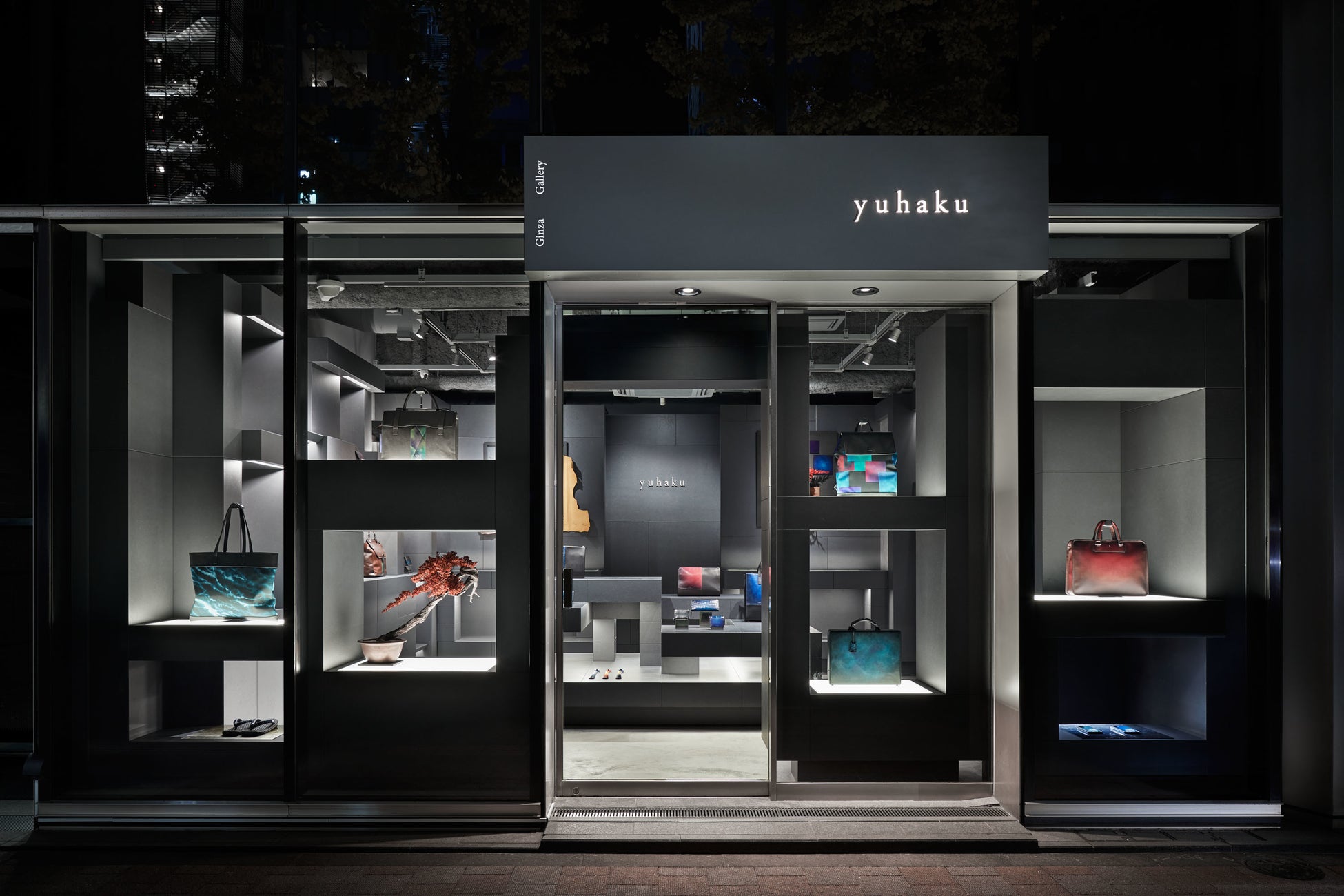2020年12月17日、銀座にオープンしたyuhaku初の旗艦店。yuhakuのレザーアイテムのほか、代表 仲垣友博によるレザーアートや、書家 杉田廣貴氏とのコラボアイテムなど、レザーのアート性を追求した作品を多数展示販売する。