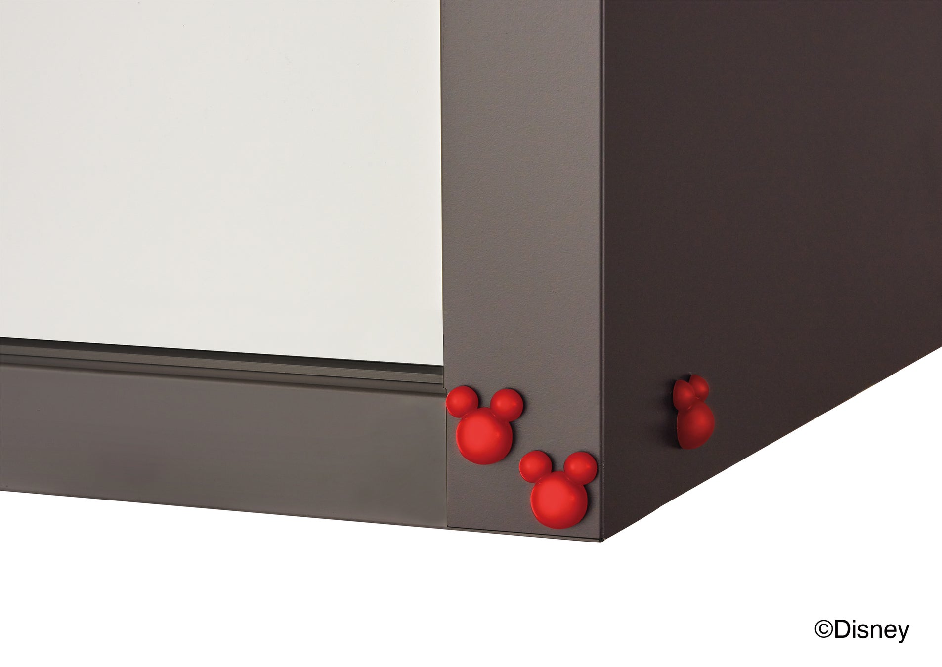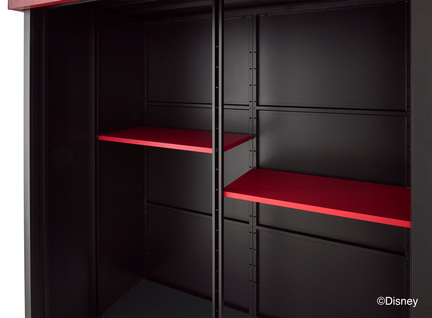 スチール製物置 主要構造部材: 溶融亜鉛めっき鋼板(カラー鋼板) カラー: ミッキーマウスモデルカラー (壁・床:ブラック、屋根・棚板:レッド、扉:ホワイト) |