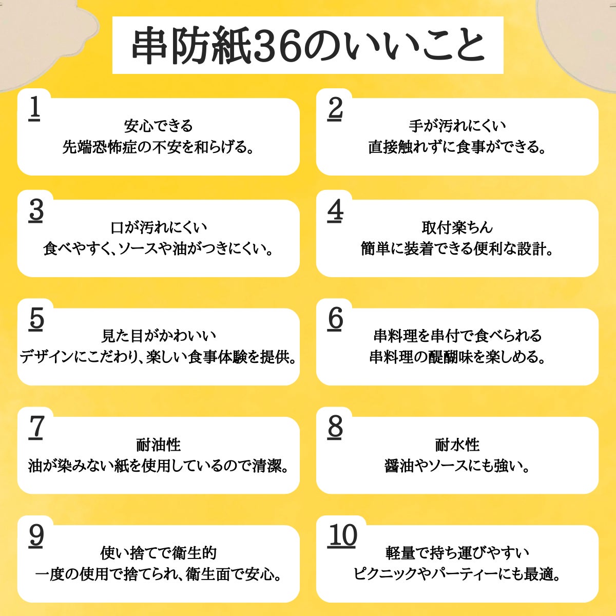 ※「串防紙36」は、先端恐怖症の方が安心して串料理を楽しむためのサポート商品です。ただし、効果には個人差があり、すべての先端恐怖症の方が安心してご使用いただけるわけではありません。ご了承の上、ご利用ください。