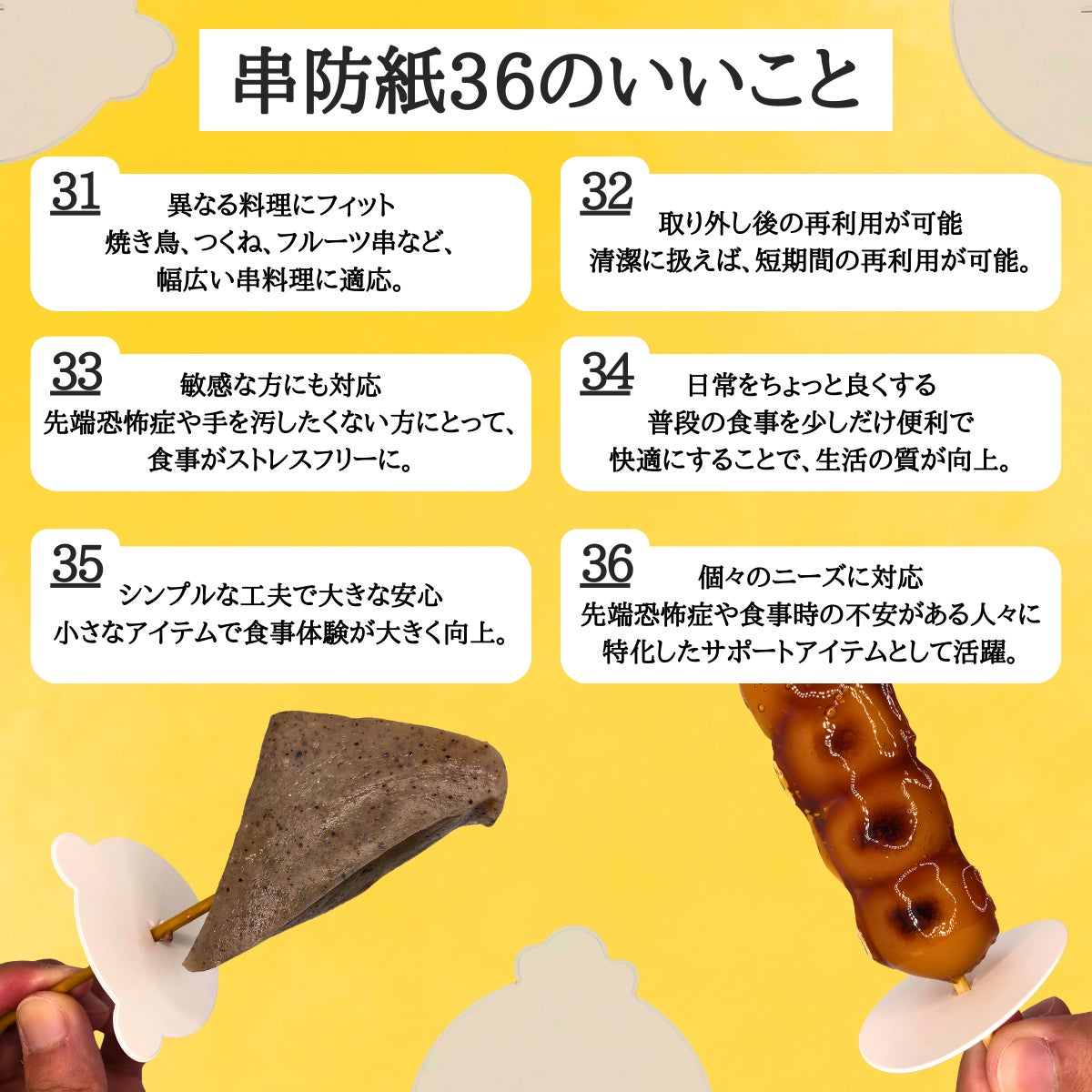 「串防紙36」は、先端恐怖症の方やあらゆる年齢層の方々が、串料理をより安心・快適に楽しめるよう開発された商品です。