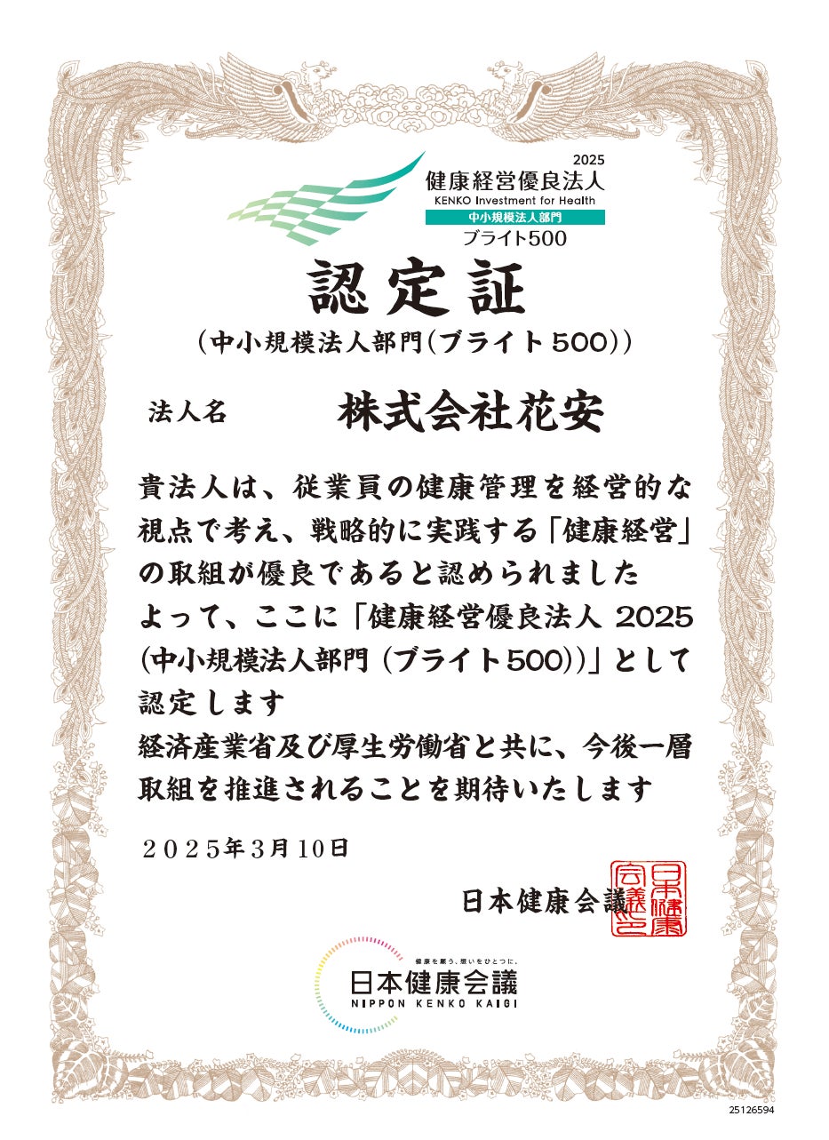 株式会社花安(本社:新潟県新発田市、代表取締役:渡辺安之)は、2024年3⽉10⽇(月)に健康経営優良法人2025(中小規模法人部門)に認定されました。健康経営優良法人の中でも優れた取り組みを行った中小規模法人として「ブライト500」に認定されたことをお知らせします。