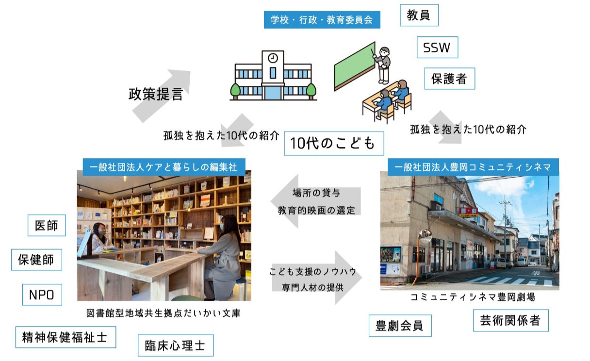 2つの非営利法人だけではなく、教育関係者、芸術関係者、地域コミュニティのみなさまとの連携により、 多様なセクターの方達との包括的なセーフティネットを築いていきます。今まで例にない「映画館」「図書館」という地域資源を活用することにより、子どもたちが足を運びやすい(外に出やすい)環境を作っています。