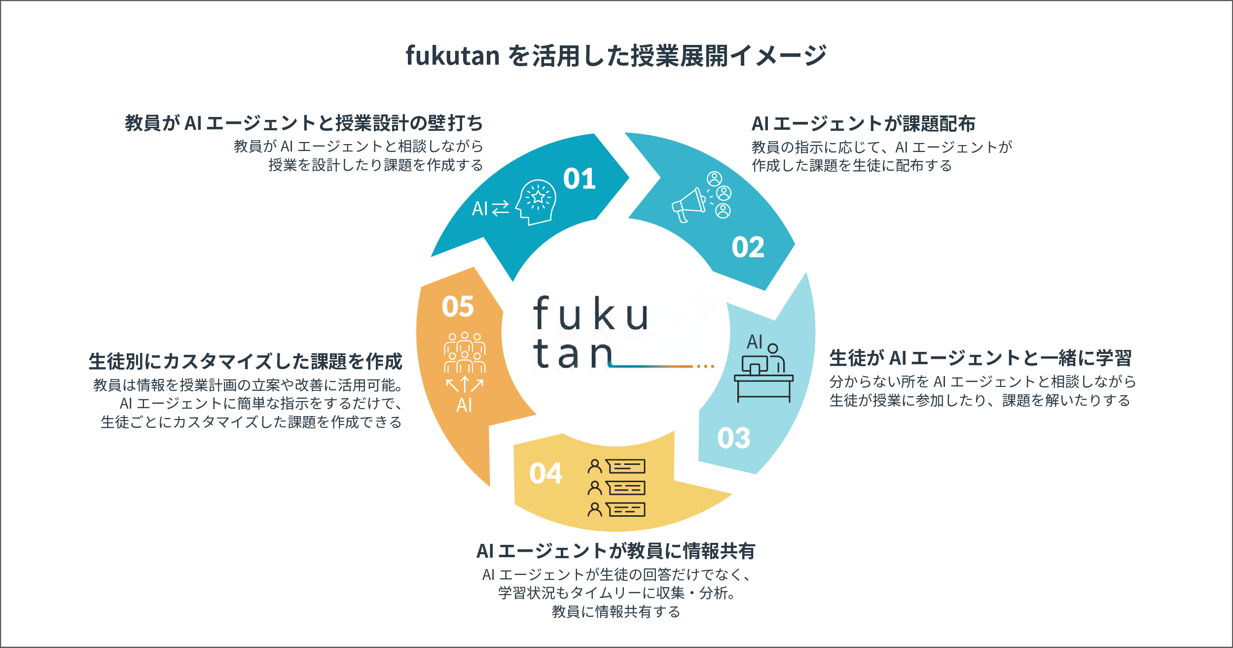 fukutanは、教員の授業設計や生徒の習熟度に合わせた指導を支援するとともに、生徒が授業で分からない点などを質問・相談できる相手として、副担任のように学びの場を支えます。