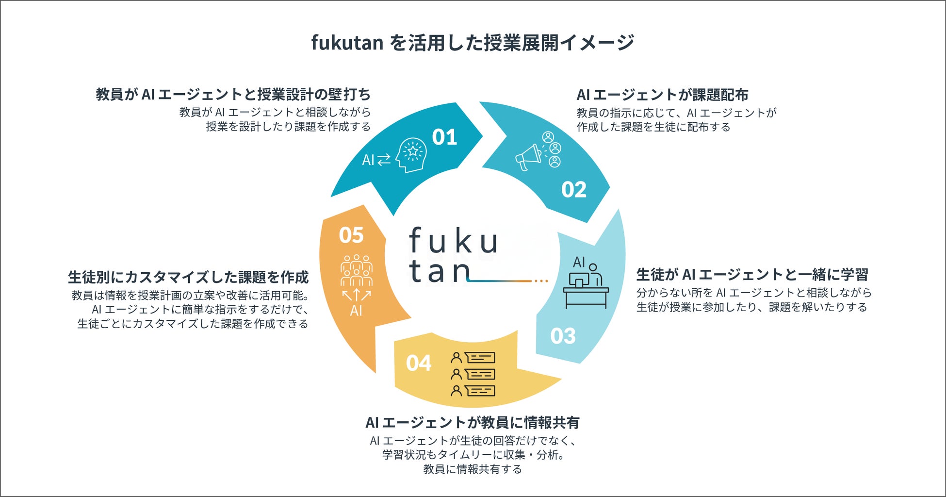 fukutanは、授業内外でのやり取りを通じて生徒の学習状況を把握し、教員の授業設計・課題作成・振り返りを支援します。生徒にとっては思考を整理し発展させる「壁打ち相手」となり、教員にとっては個別最適化と授業改善を進めるための補助線となることで、学びの深化と教員の省力化の両立を目指します。