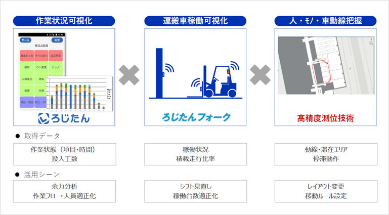 株式会社ゼンリンデータコム(所在地:東京都港区、代表取締役社長:清水 辰彦、以下:ゼンリンデータコム)と、株式会社NX総合研究所(所在地:東京都千代田区、代表取締役社長: 廣島 秀敏、以下:NX総合研究所)は、ゼンリンデータコムが持つ屋内外高精度測位情報の活用技術とNX総合研究所の倉庫作業分析ツール「ろじたん」を組み合わせることにより、物流センター内や工場内等の生産現場におけるヒト・モノ・クルマの状態の可視化を実現し、生産性を改善するためのサステナブルな取り組みを支援するサービスの提供を開始しました。
