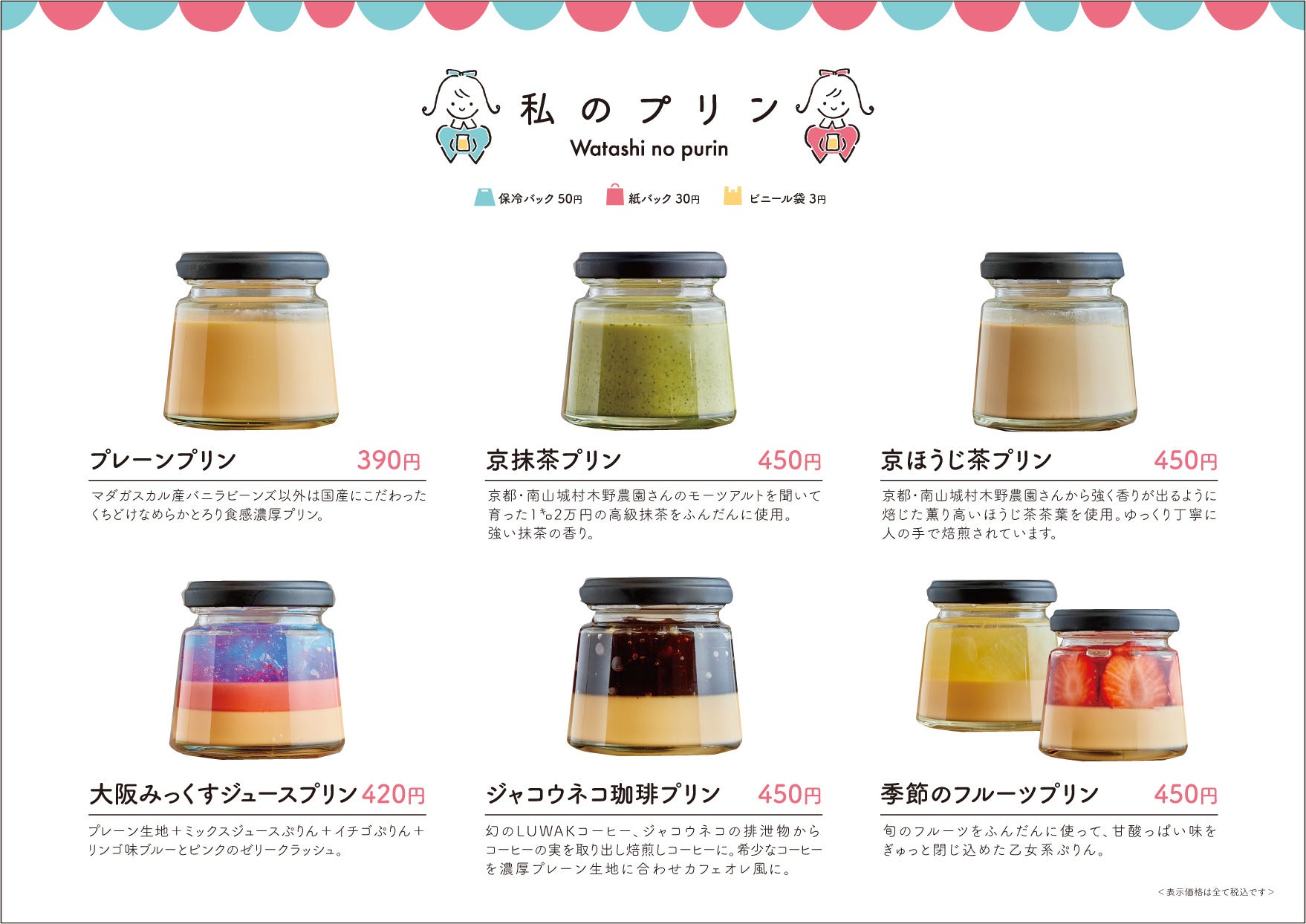 「私のプリン販売所」では大阪みっくすジュースプリンのほか、プレーンプリンや京抹茶プリン、京ほうじ茶プリンといった豊富なプリンを販売するほか、店舗限定商品としてクリームソーダをイメージしたレトロかわいい「難波creamsodaプリン」もご用意しております。