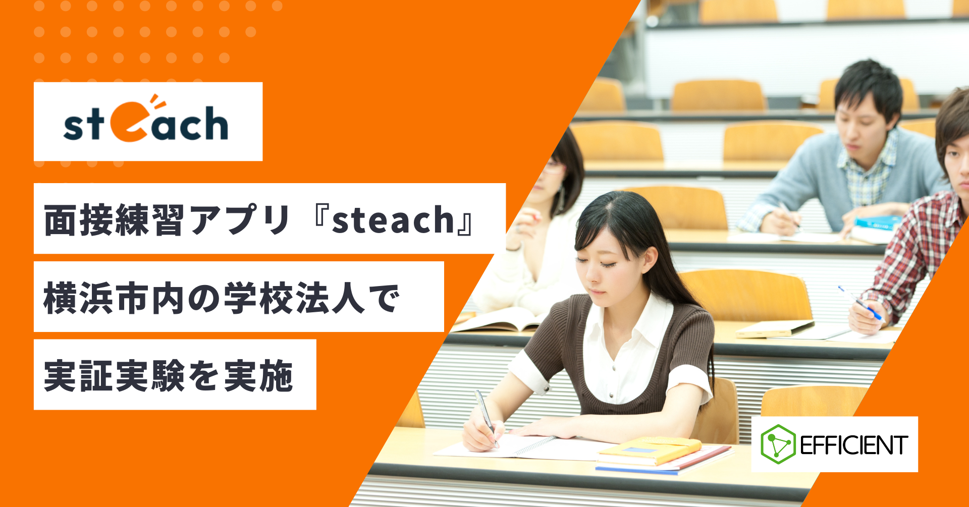株式会社エフィシエント(本社:横浜市西区 代表取締役社長:脇坂健一郎 以下、EFFICIENT)と、就職支援事業を展開する株式会社ジェイック(本社:東京千代田区 代表取締役社長:佐藤剛志 以下、ジェイック)が共同開発する面接練習アプリ『steach』が、横浜市内の学校法人で横浜市の支援のもと実証実験を実施しました。この実証実験では、就職活動をする学生とそれをサポートする学校法人のキャリアセンターの負荷軽減のため、両者に面接練習アプリsteach(スマホ、web)を無償提供して業務負荷の軽減の効果について実証実験をしました。