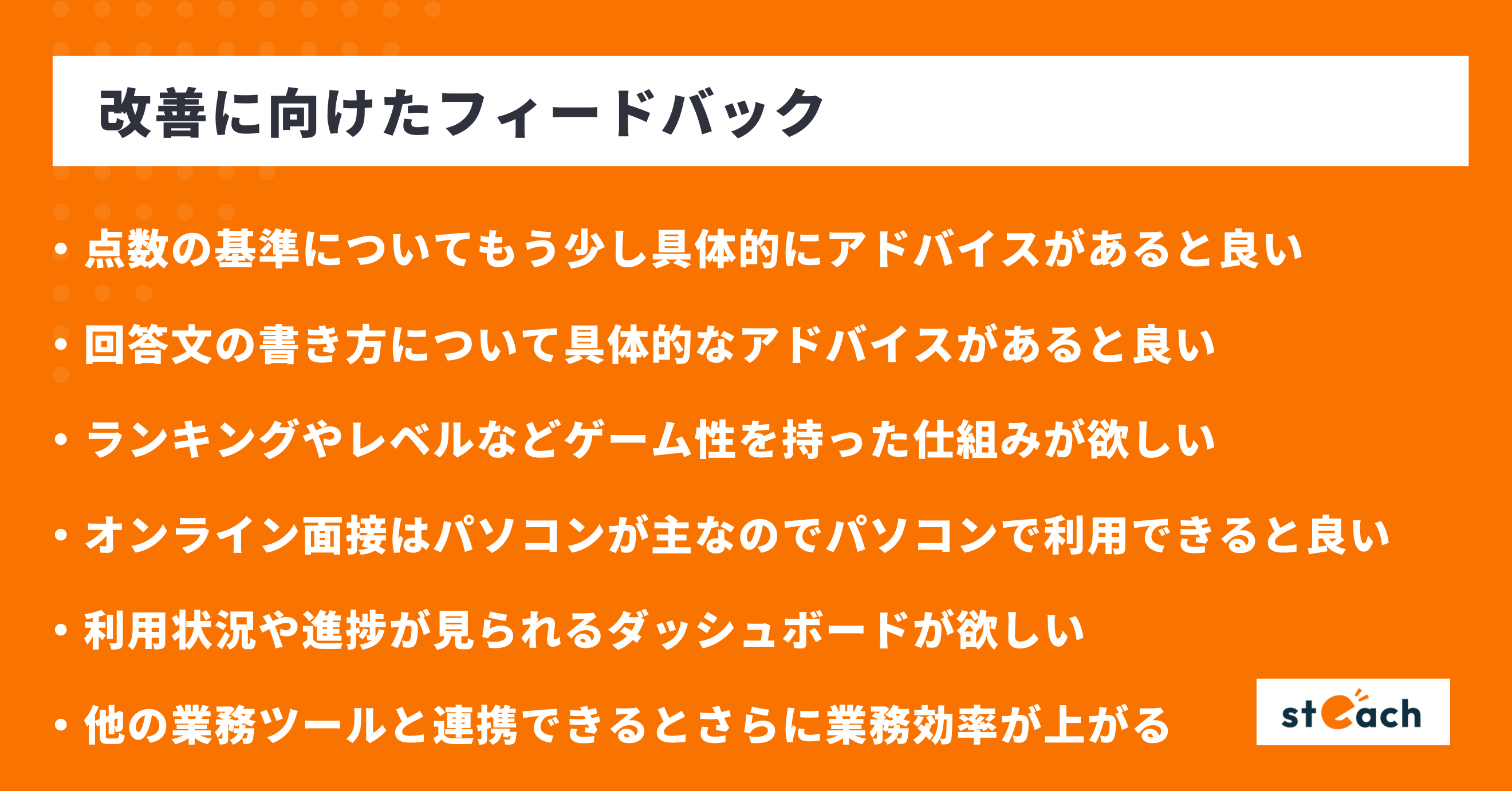 実施内容:面接を練習するスマホユーザー(主には学生)とそれを管理する学校法人の管理者ユーザー(主にキャリアセンターや就職支援課)にsteachを利用頂くことで、アプリに不足している機能の洗い出しを行い、学校法人での就職活動支援の業務効率化が可能か実証実験を実施しました。