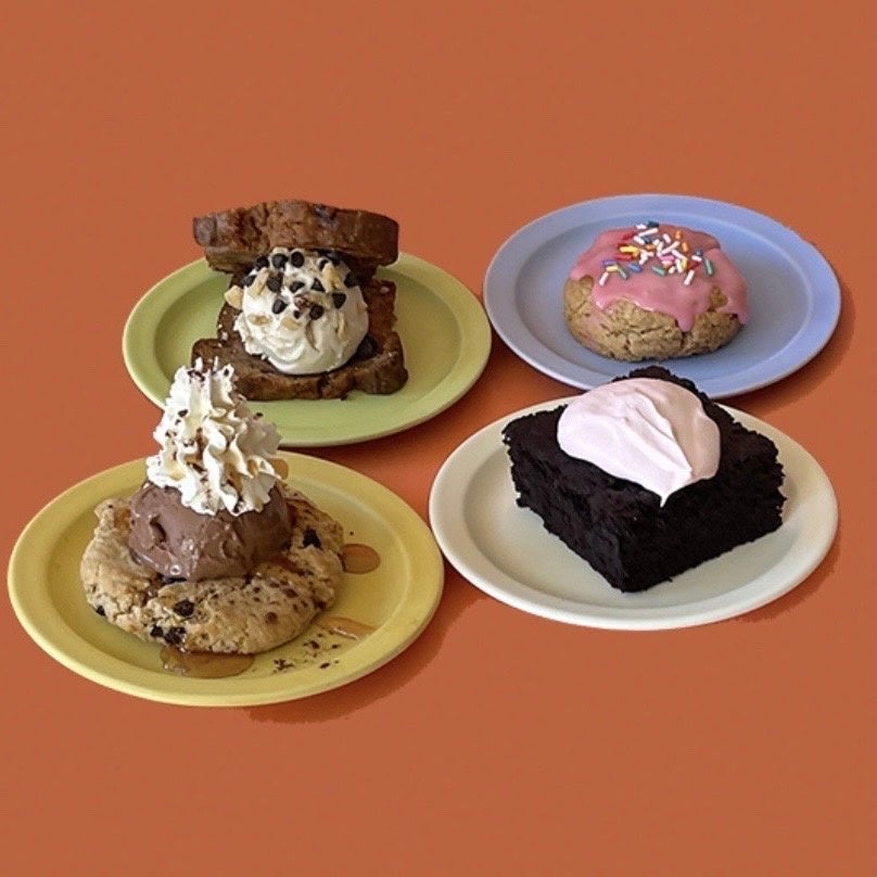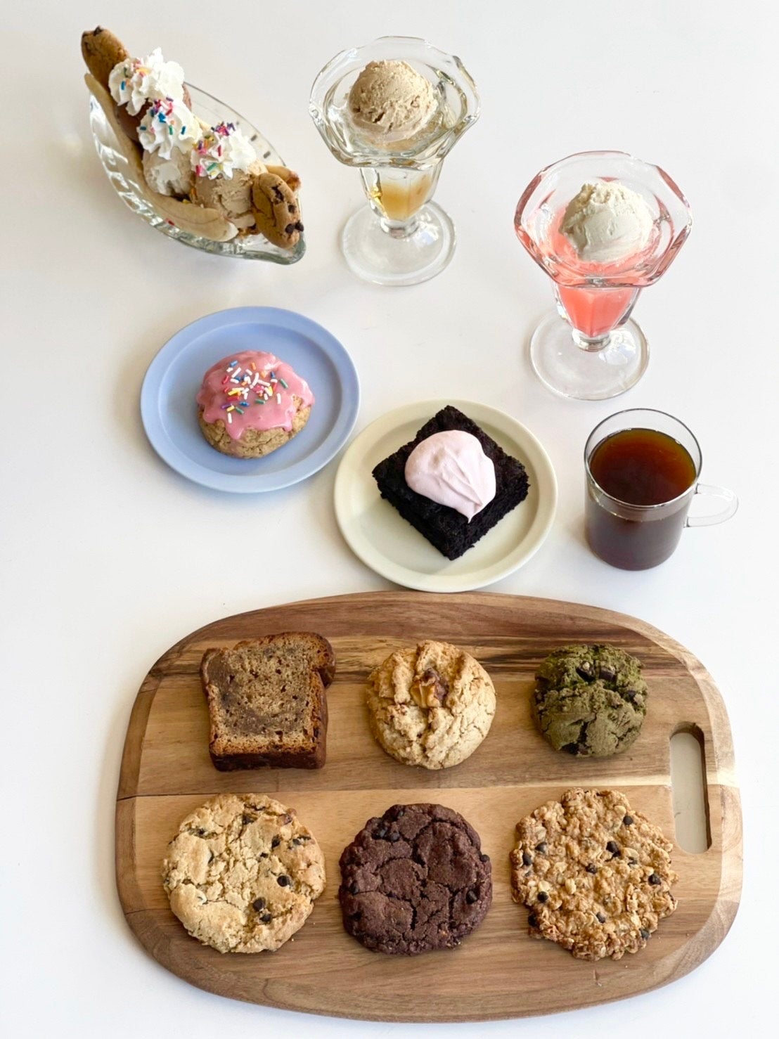 (1枚目:ラズベリークリームソーダ 750円/2枚目:左上から時計回りに バナナブレッドサンド 880円、チェリーアンドチョコレートスコッキー 580円、ブラウニーホイップ 750円、クッキーサンデー 980円 ※価格は全て税抜)