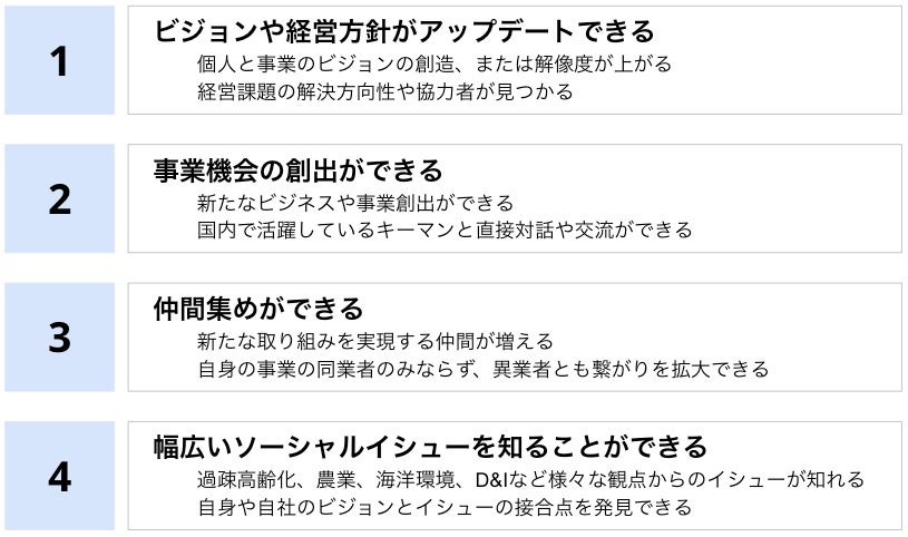 既存事業、新規事業開発などの所属領域にかかわらず、新しい事業領域の探索やソーシャルイシューに関心を持たれている事業会社の経営層、管理職やスタートアップ、NPOの経営層、行政自治体関係、金融機関の方々などが対象となります。