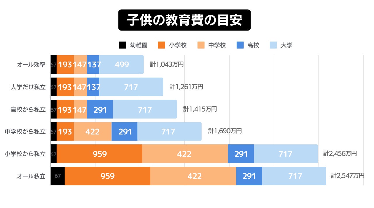 子供の教育資金にかかるお金の目安は全て私立の場合約2,500万円、全て公立の場合でも約1,000万円と言われています。