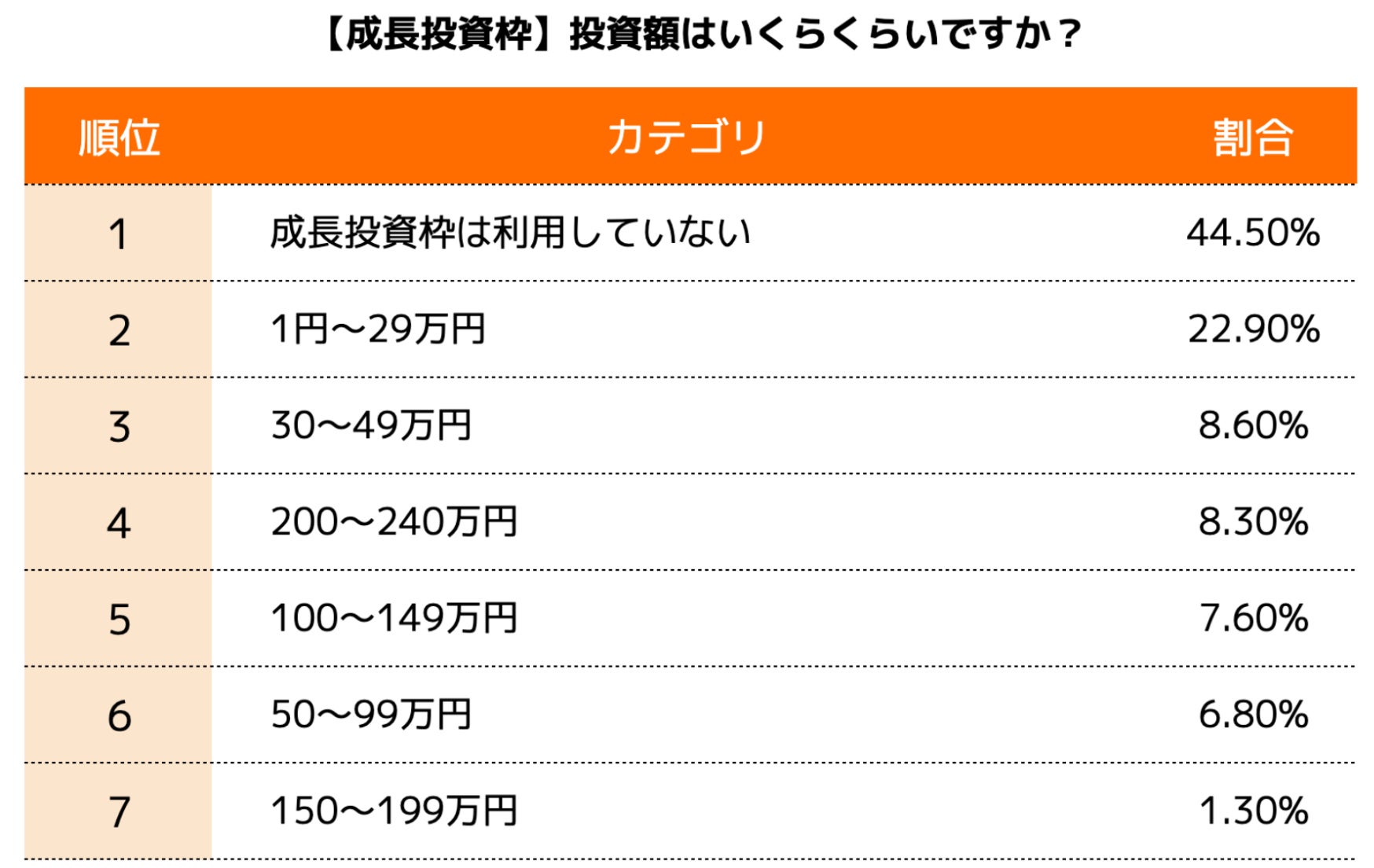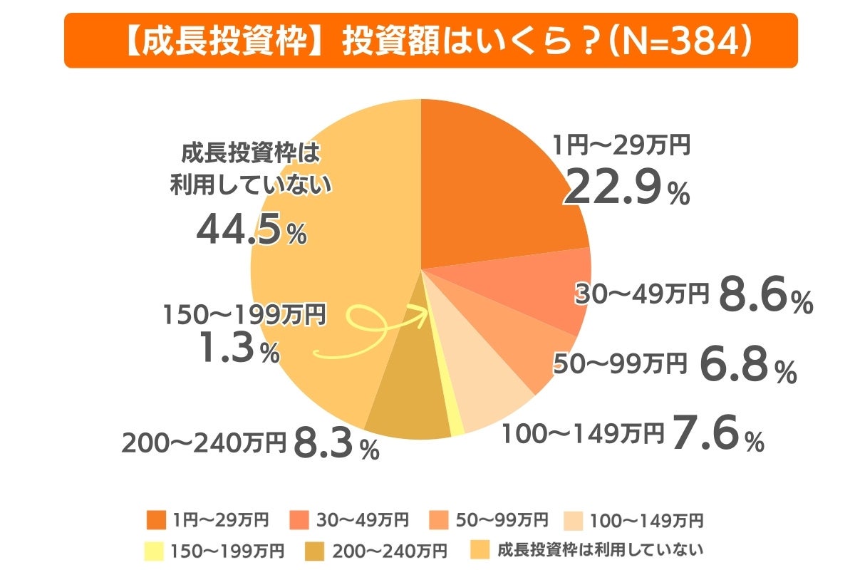 成長投資枠は利用していない方を除いて、「1万円〜29万円」を活用していると回答した方が最多で全体の23%程度でした。