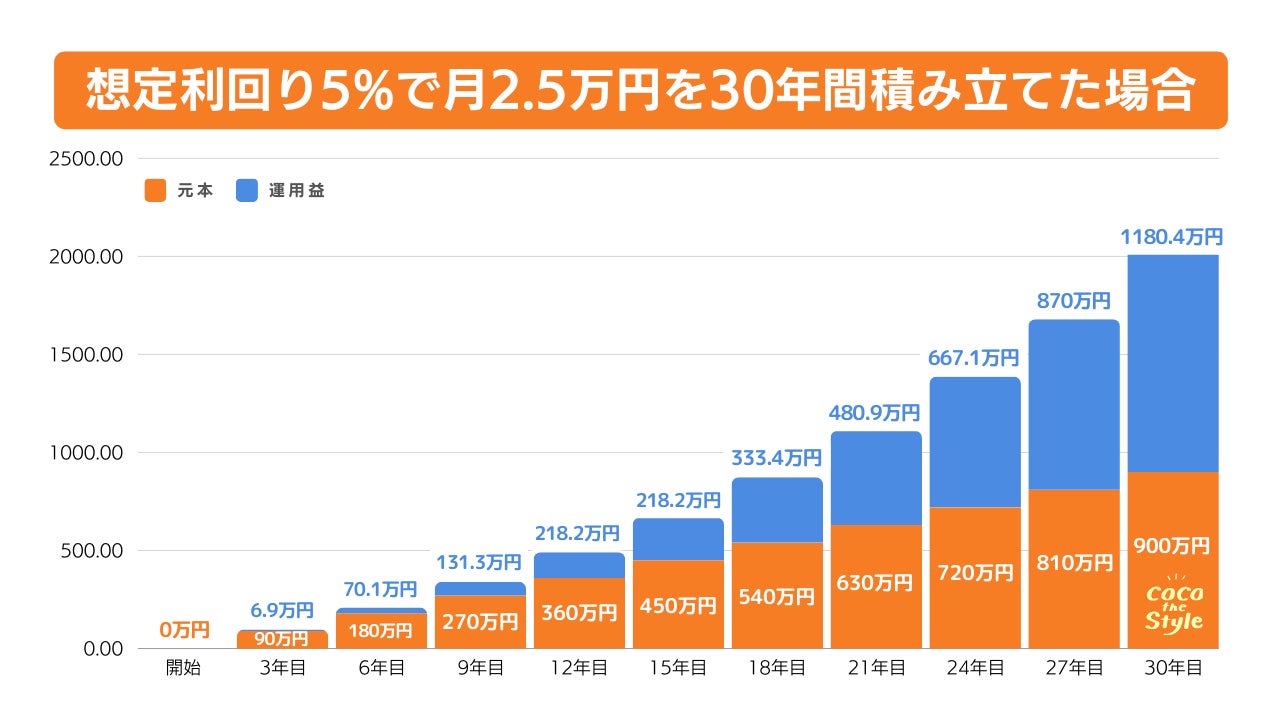 つみたて投資を月2.5万円で続けると、2,000万円近くの金融資産を持つことができる計算になります。