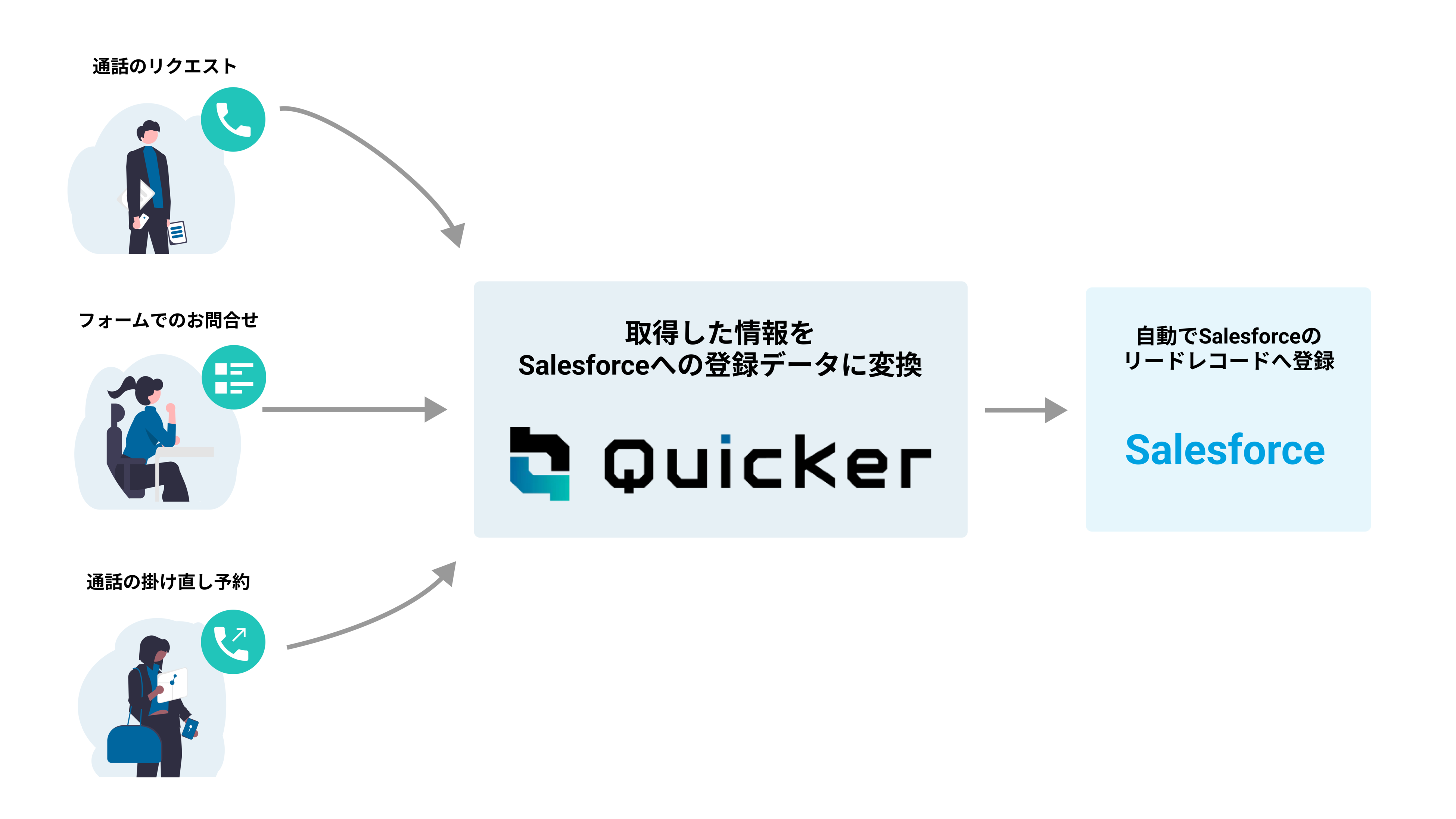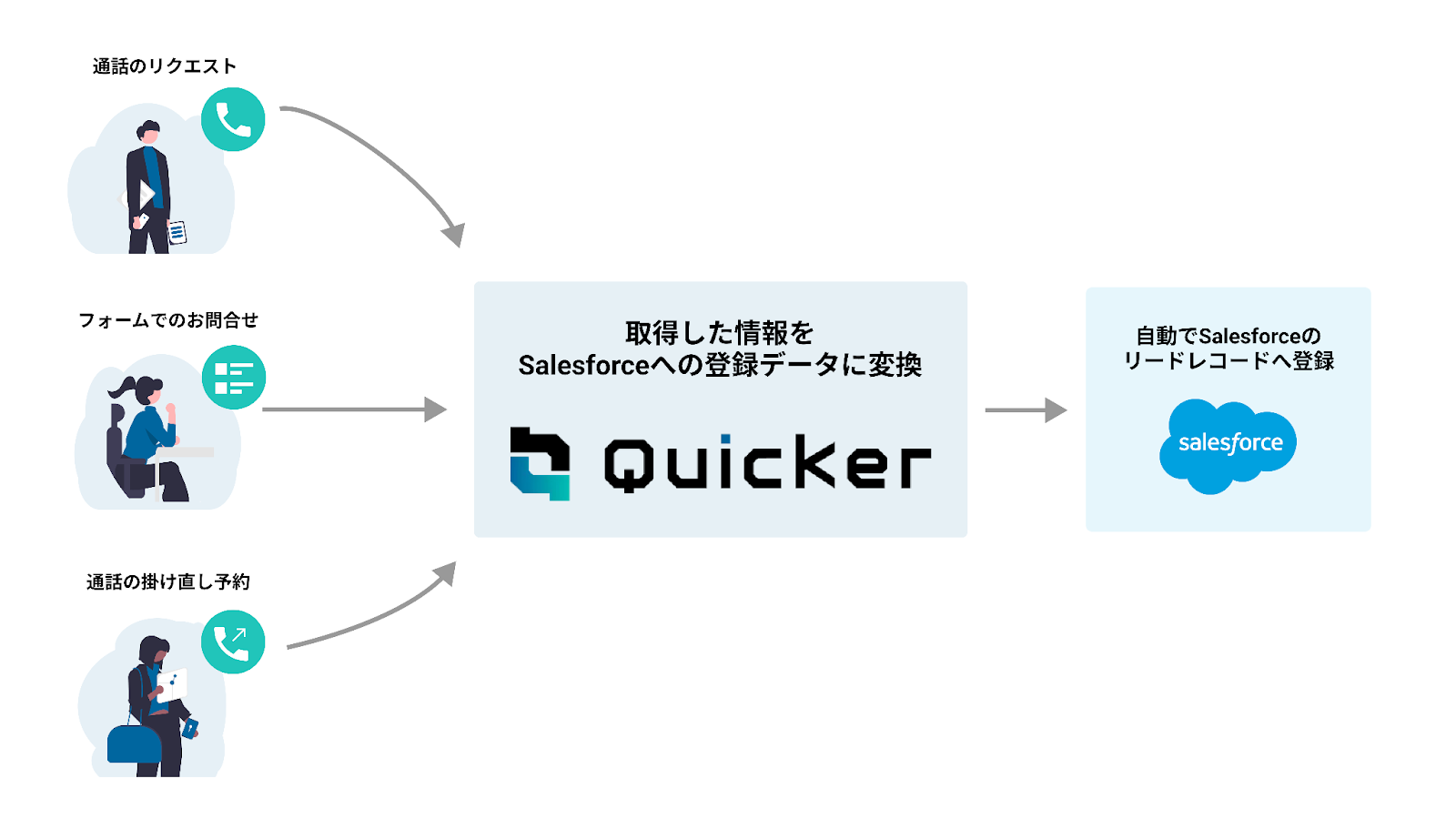 見込み顧客の情報をリアルタイムでQuickerからSalesforceへ連携することで、Quicker経由で流入した見込み顧客に対してSalesforceからより適切なアプローチが可能となります。