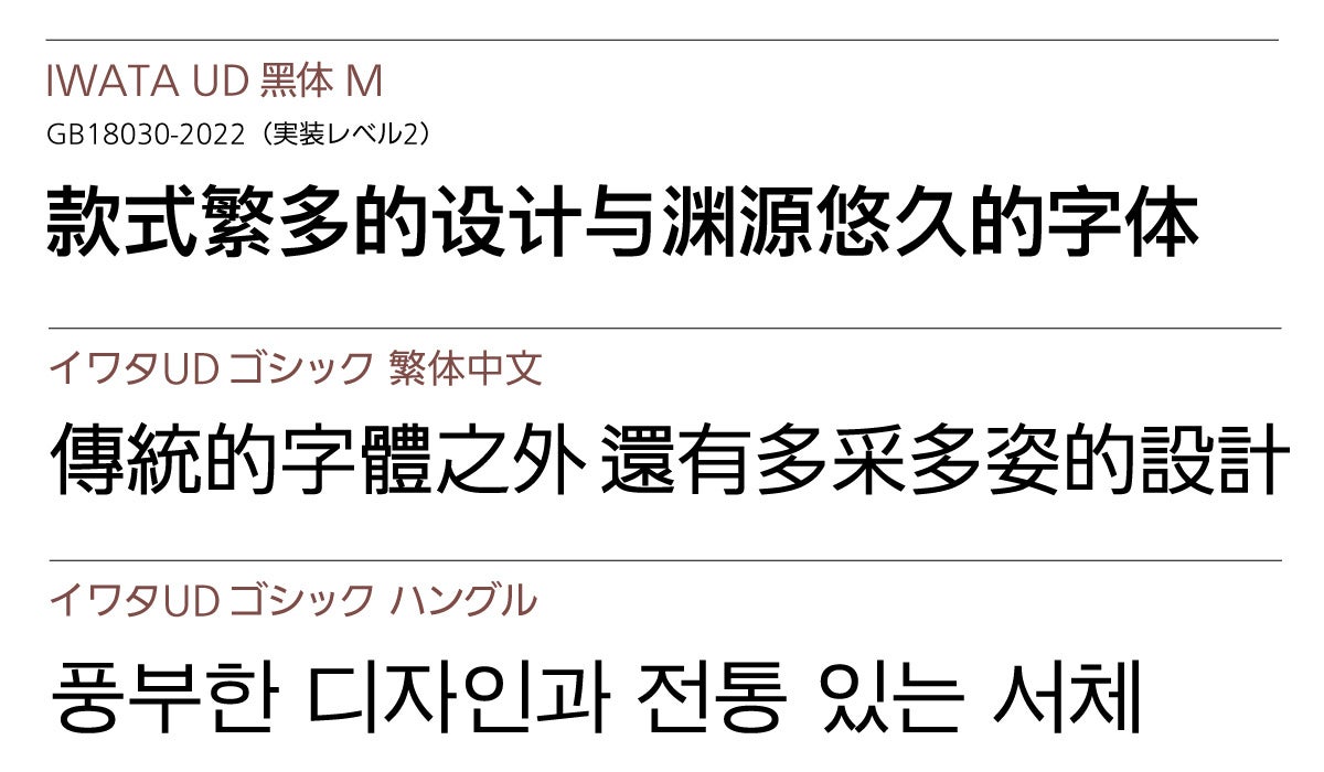 「イワタUDゴシック多言語対応フォント」は、2006年に日本で初めて「高齢者や弱視の方にも見やすいフォント」として、パナソニックとイワタで共同開発した日本語フォント「イワタUDゴシック」をベースに中国語(簡体、繁体)、ハングルを開発しました。