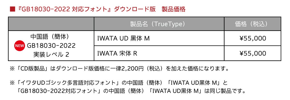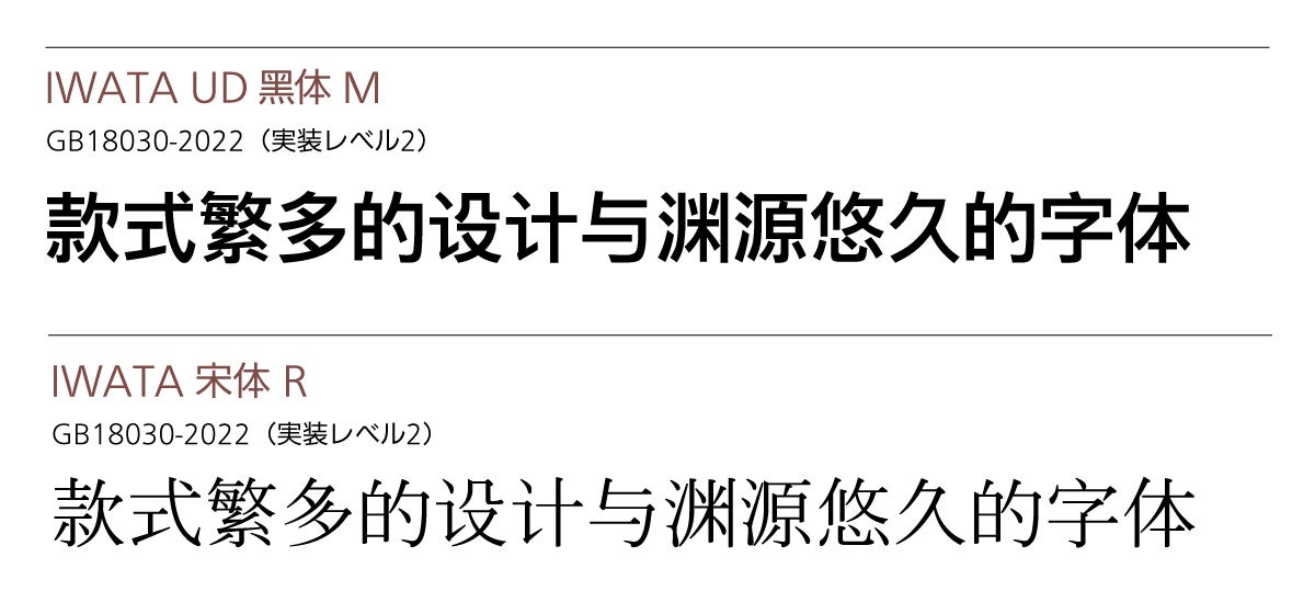 中国に輸出する製品や中国で販売する製品に中国語フォントを搭載する場合、中国の国家標準規格であるGBの最新規格「GB18030-2022」に準拠したフォントを使用する必要があります。その規格に対応した中国語簡体字「IWATA UD黑体 M」「IWATA 宋体 R」も発売しました。日本国内だけでなく中国国内向け製品にもご使用いただけます。