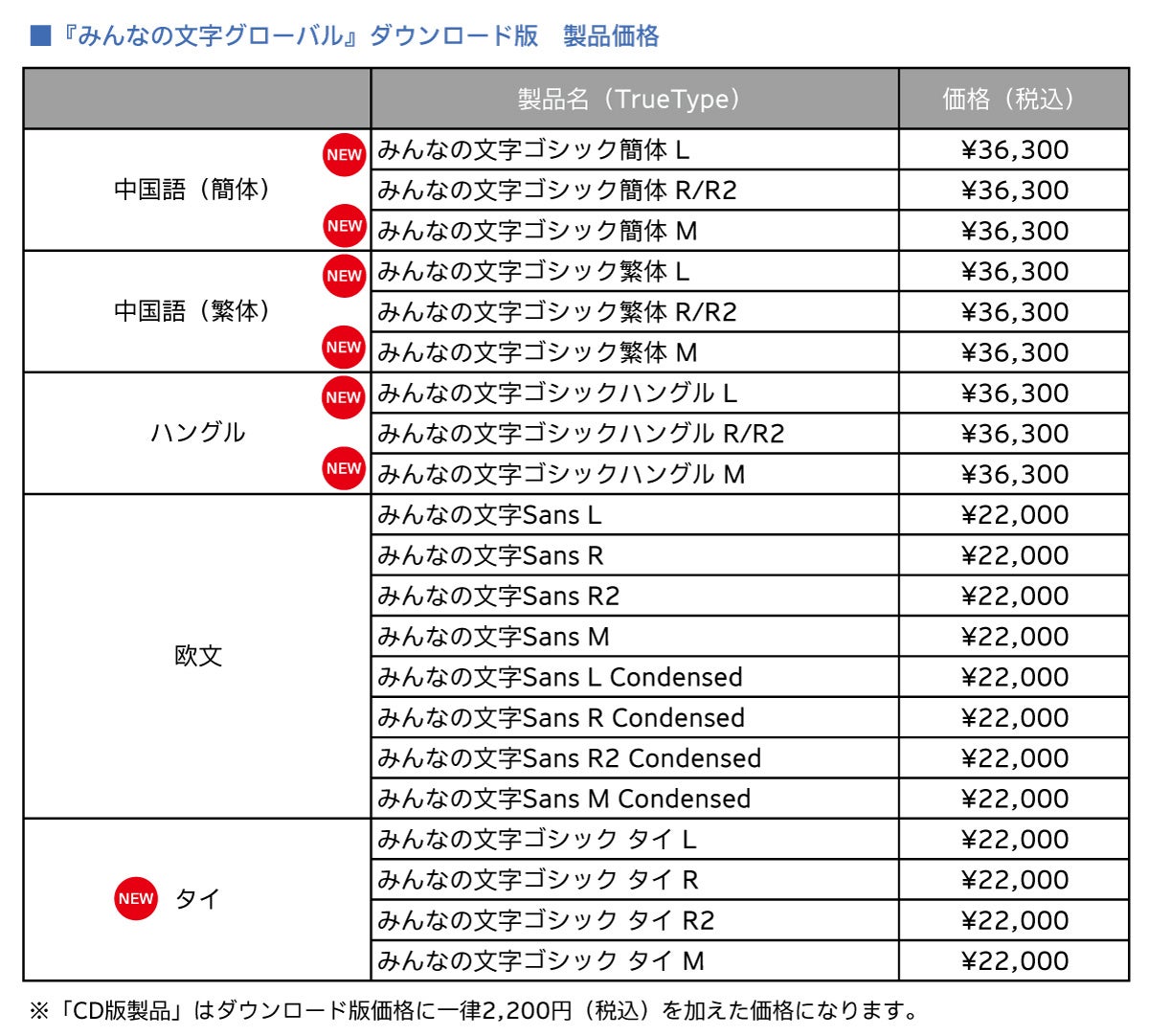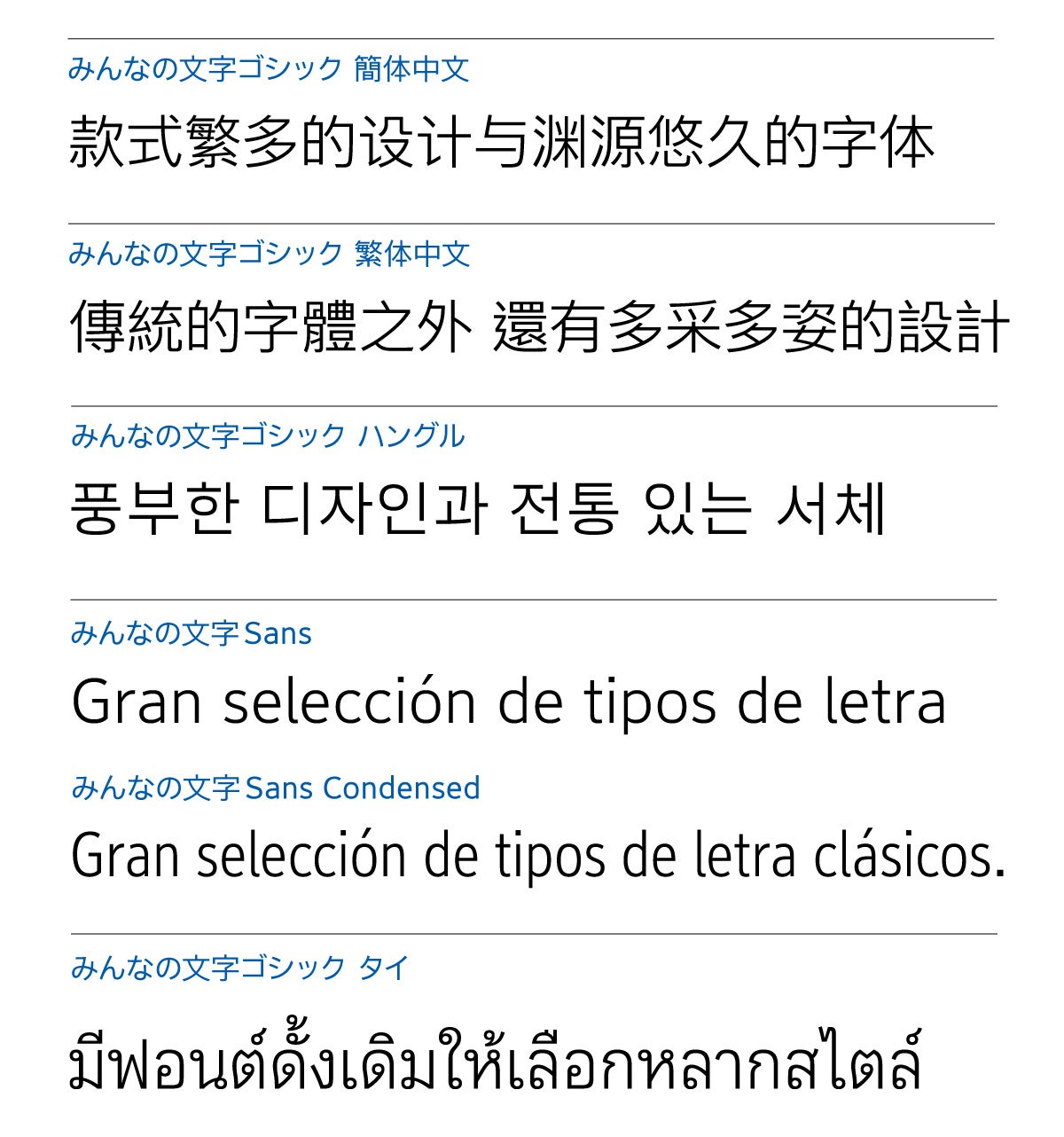 ファミリーにタイ語(L/R/R2/M)が加わり訪日外国人が使用する言語の90%(注1)以上のサポートが可能になりました。中国語(簡体、繁体)、ハングルは不足していた文字の太さ(L/M)を追加し各言語での統一したデザインを可能にしました。