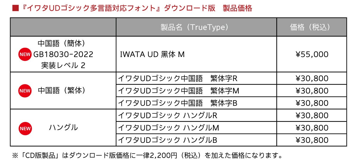 ※「イワタUDゴシック多言語対応フォント」の中国語(簡体)「IWATA UD黑体 M」と「GB18030-2022対応フォント」の中国語(簡体)「IWATA UD黑体 M」は同じ製品です。