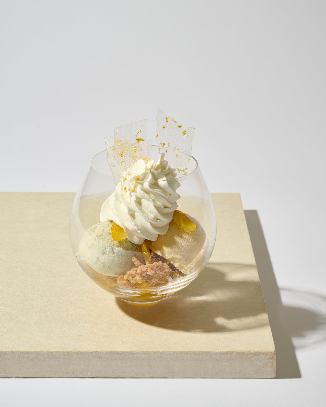 カルダモン風味クランブル、甘夏のコンフィ、シソのアイス、日向夏のソルベ、クレームシャンティ、甘夏ゼストのクリスタリヌ