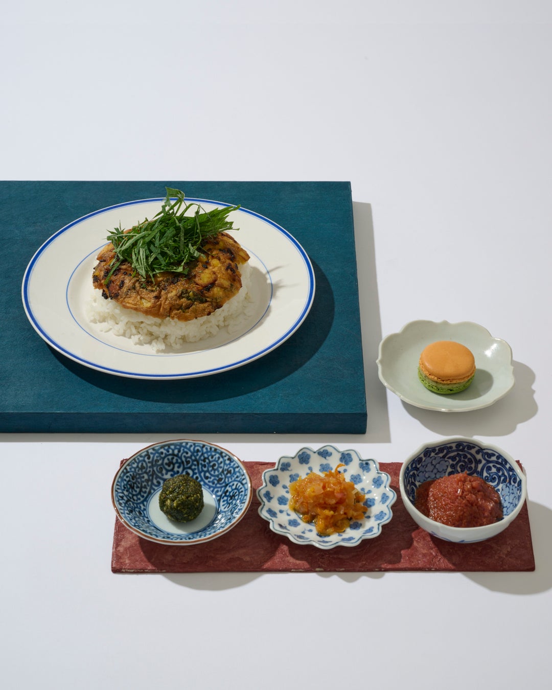 玉ねぎとポテトのオムライスに、爽やかなシソを乗せて。3種の薬味(オニオンとトマトのサルサ、甘夏と玉ねぎのコンフィ、シソとコリアンダーのレリッシュ)のコンビネーションをお楽しみください。プティデセール3種付き。