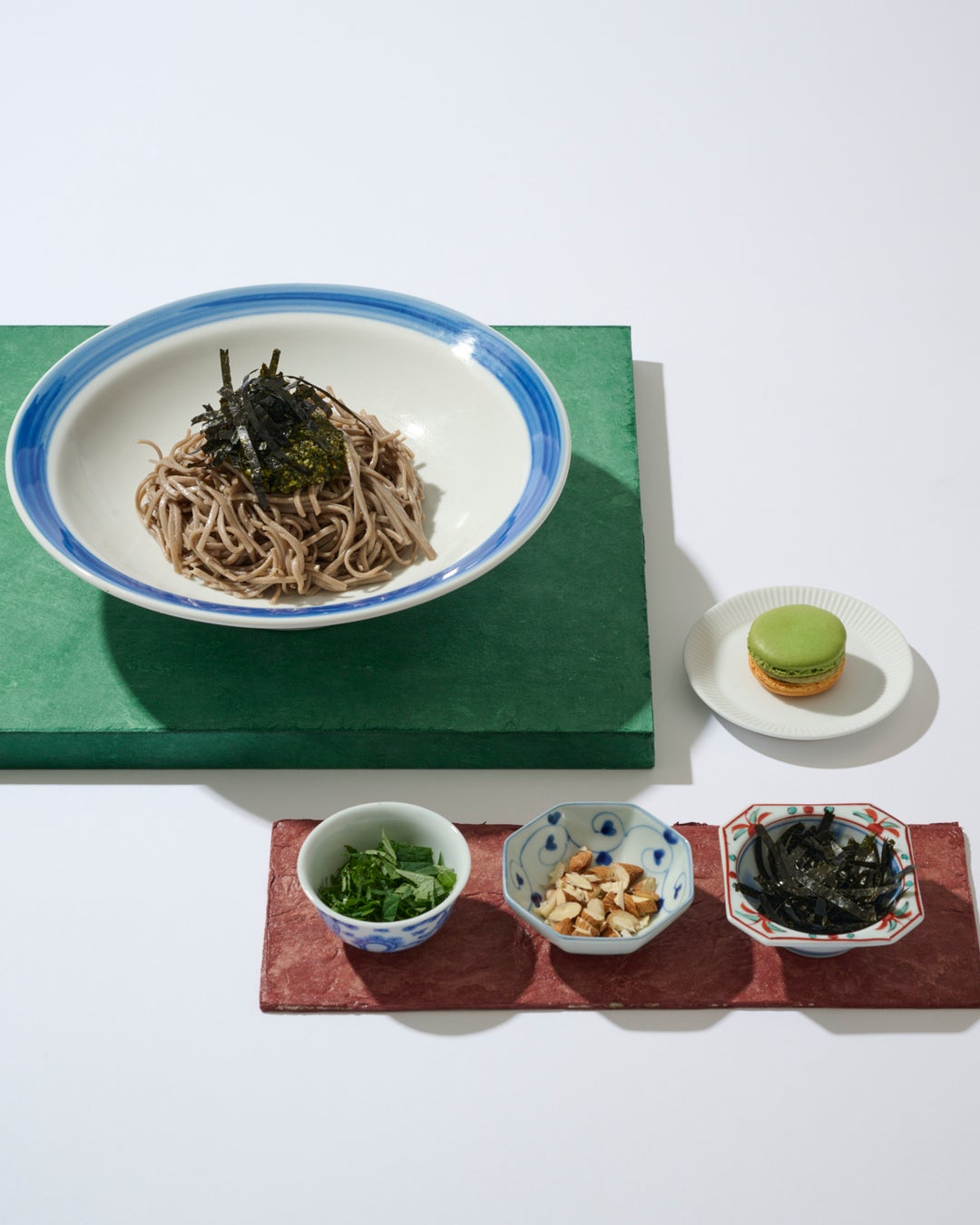 日本蕎麦にシソのペーストを添えて。 3種の薬味(シソ/くるみ/韓国海苔)で味わいの変化をお楽しみください。プティデセール3種付き。