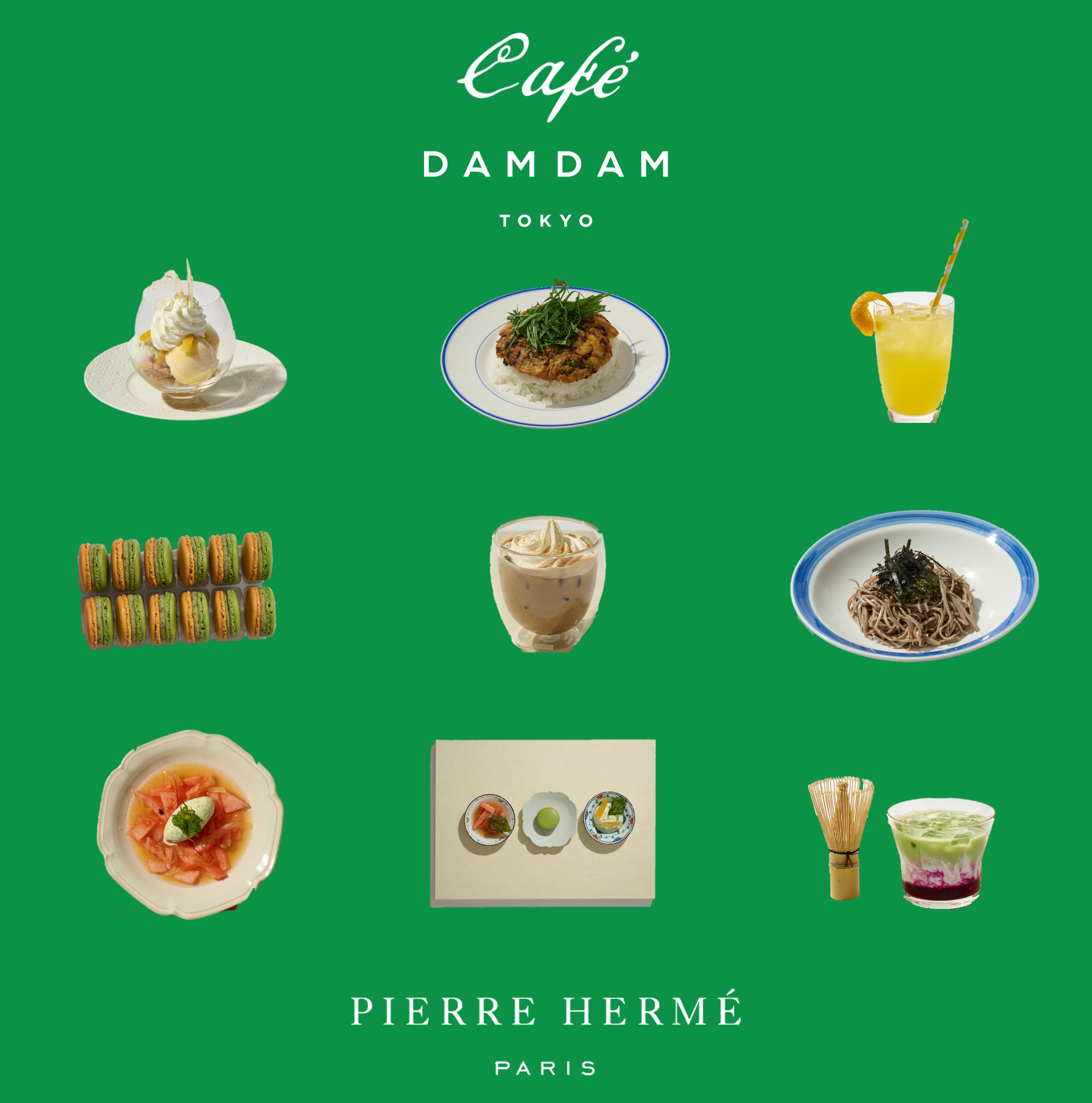 「DAMDAM TOKYO」の原点であるキッチンから生まれたレシピのフードやドリンク、「ピエール・エルメ・パリ」によるスイーツが登場