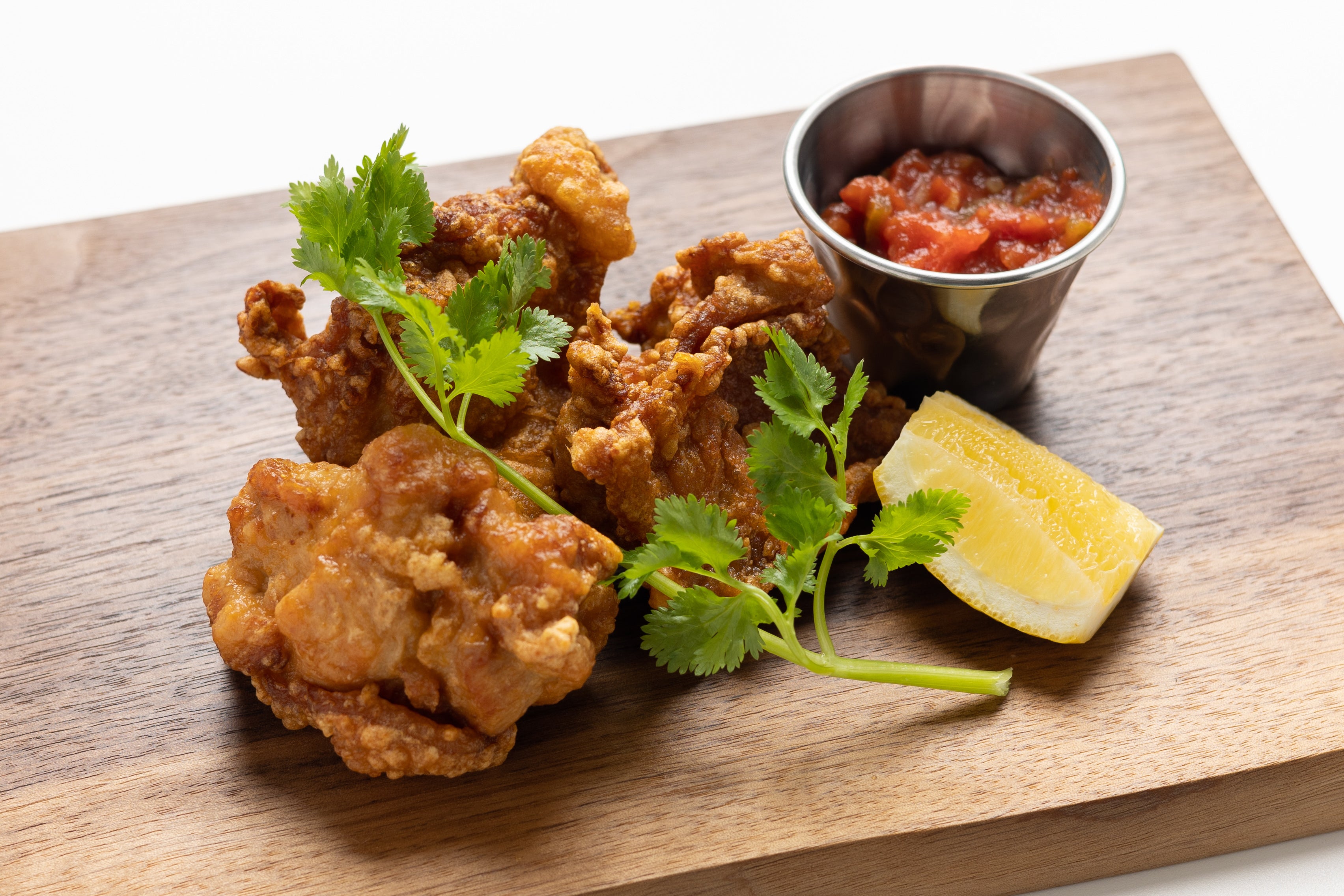 大振りな鶏肉にモチ粉を絡めて揚げた唐揚げは、カリっモチっ食感がたまらない一皿です。