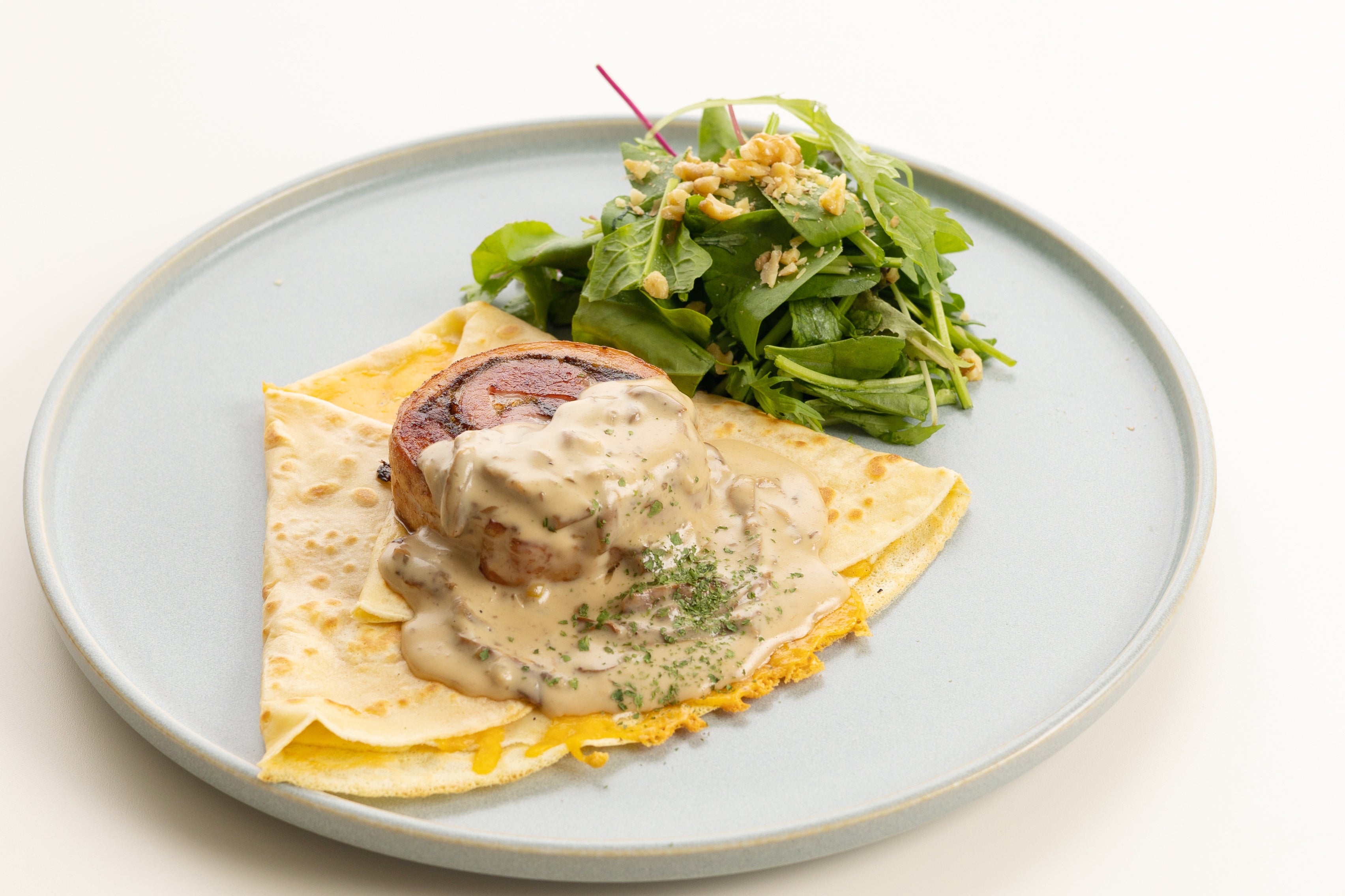 ポルケッタを大胆にもクレープに合わせた一皿。