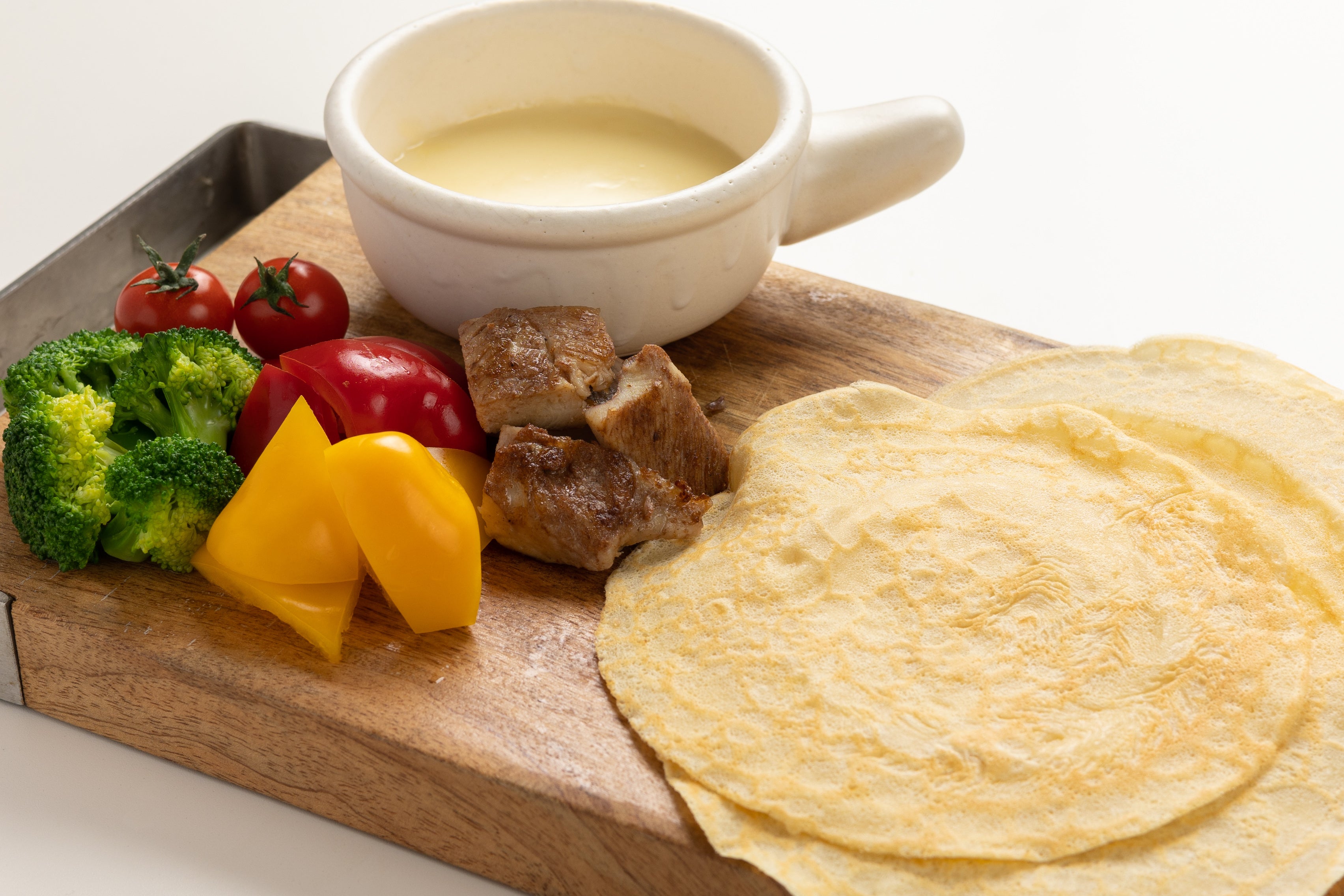 小ぶりのクレープ生地に好みの食材とトロトロチーズをかけて包み込む