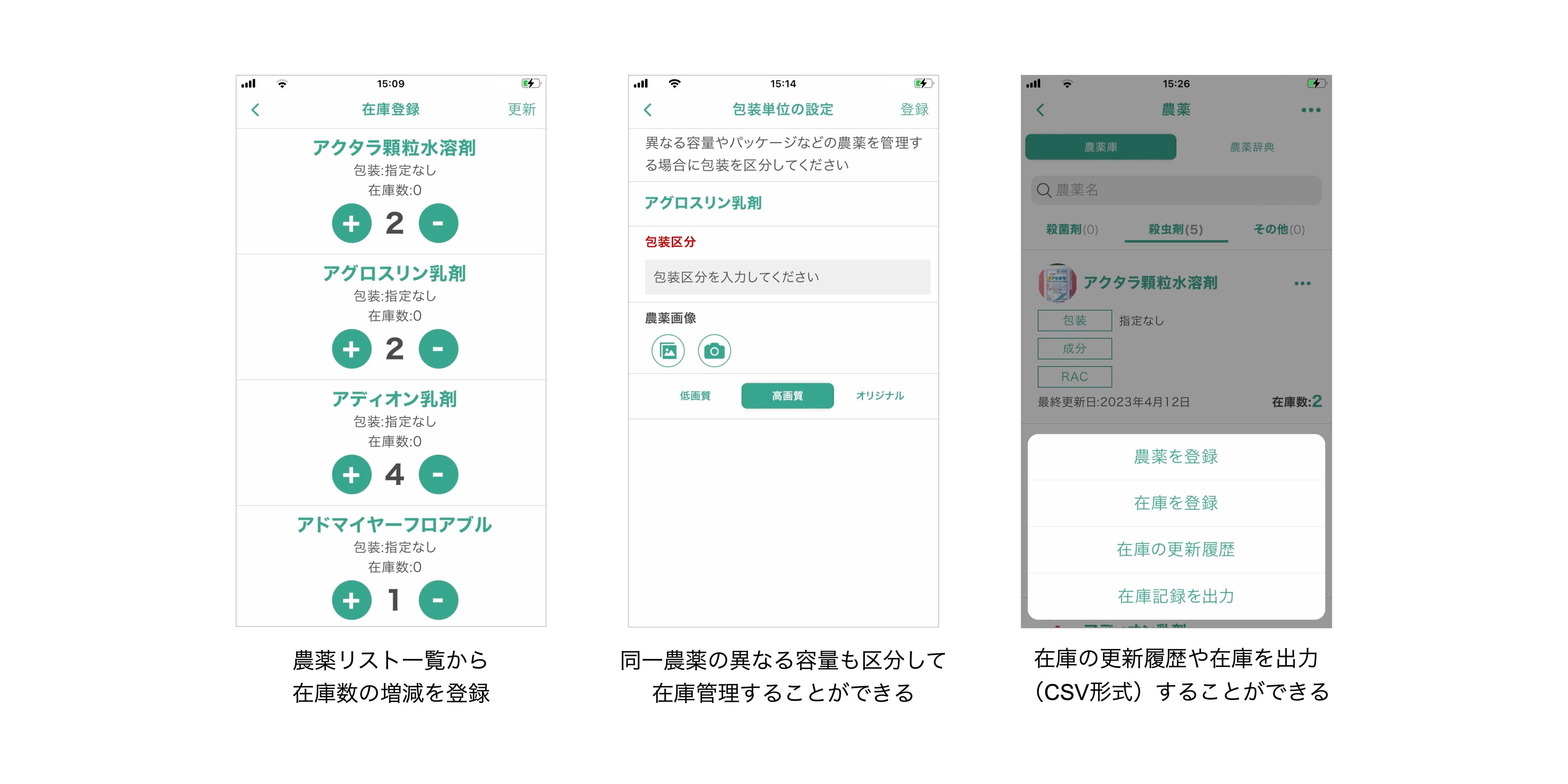 ことが可能で、在庫記録の出力やラベル情報の確認などを行うことができます。また、農薬のパッケージ規格