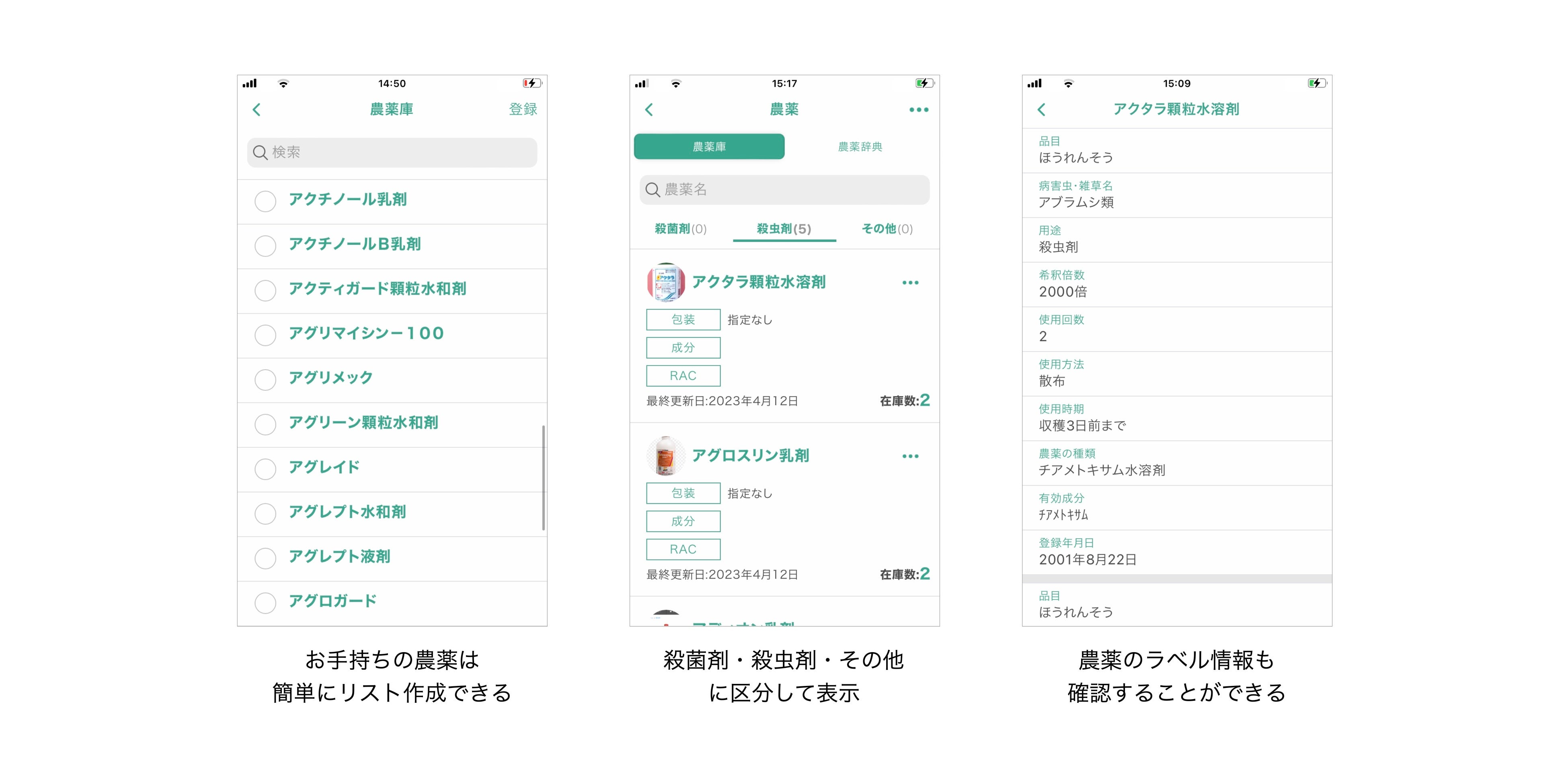 FarmChatの「農薬庫」機能は、全農薬リストのなかからお手持ちの農薬を選択し、クラウド上で在庫管理する